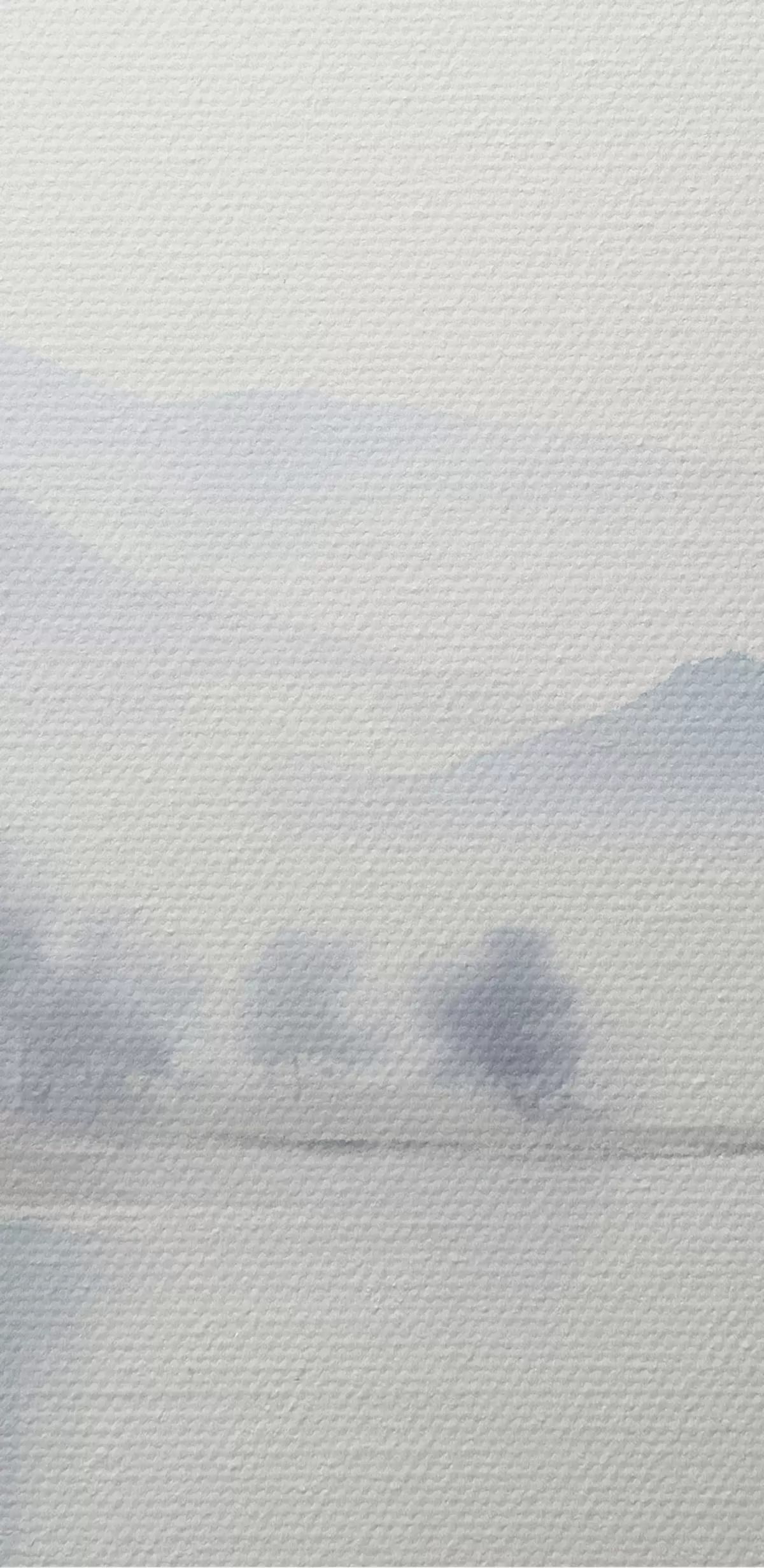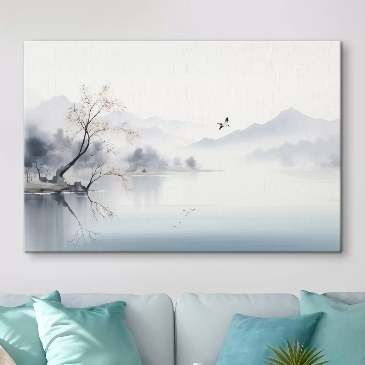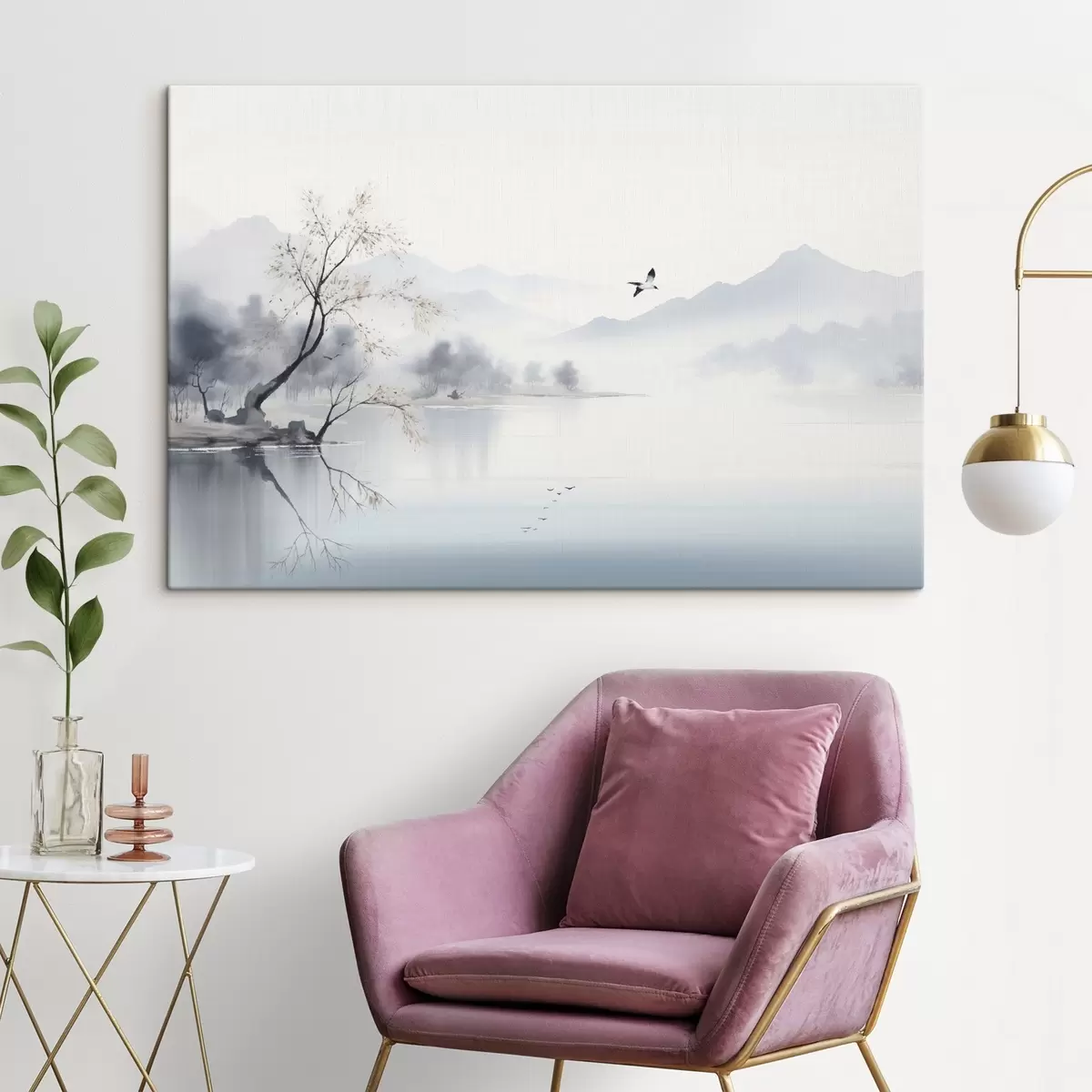 Картина Туманний пейзаж з деревом, горами та птахами Арт. s45518