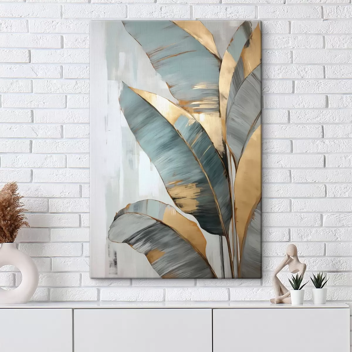 Картина Набір приглушеного синього, сірого та жовтого бананового листя з видимими мазками пензля на білому абстрактному тлі s45551