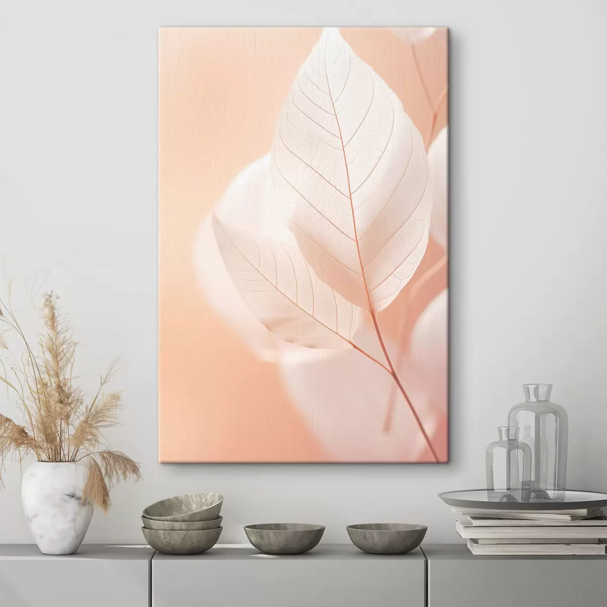 Картина Ніжне, напівпрозоре листя зі складним візерунком жилок, ніжний персиковий фон, мінімалістична ботанічна композиція s45555