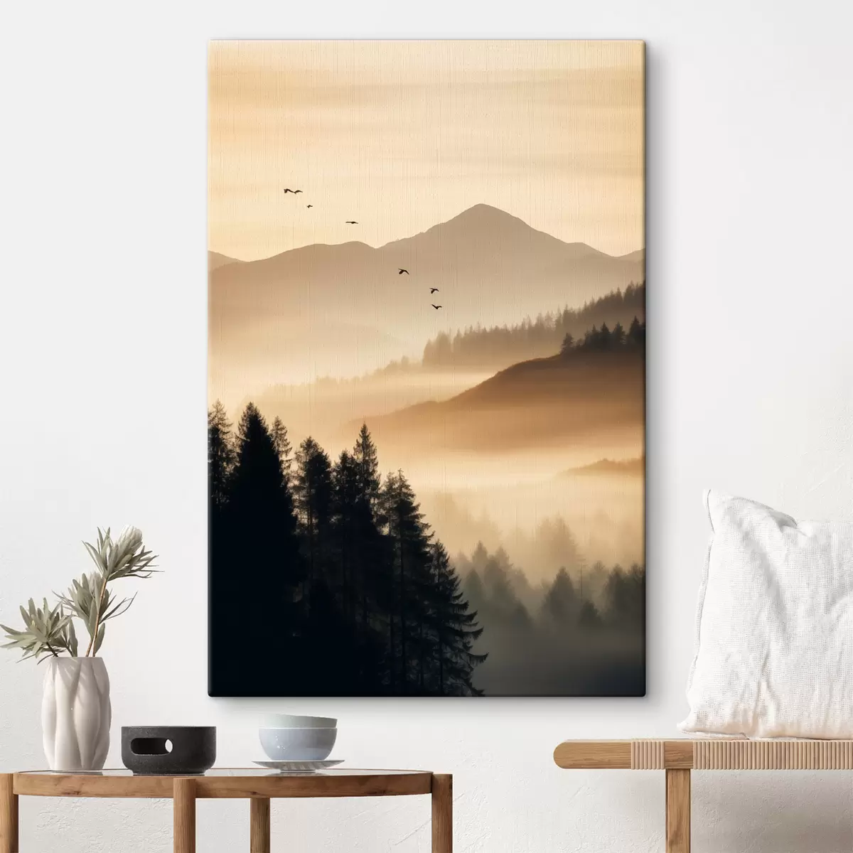 Картина Гірський пейзаж з лісом і птахами, що літають у небі, вкритий товстим шаром туману під час сходу сонця s45563