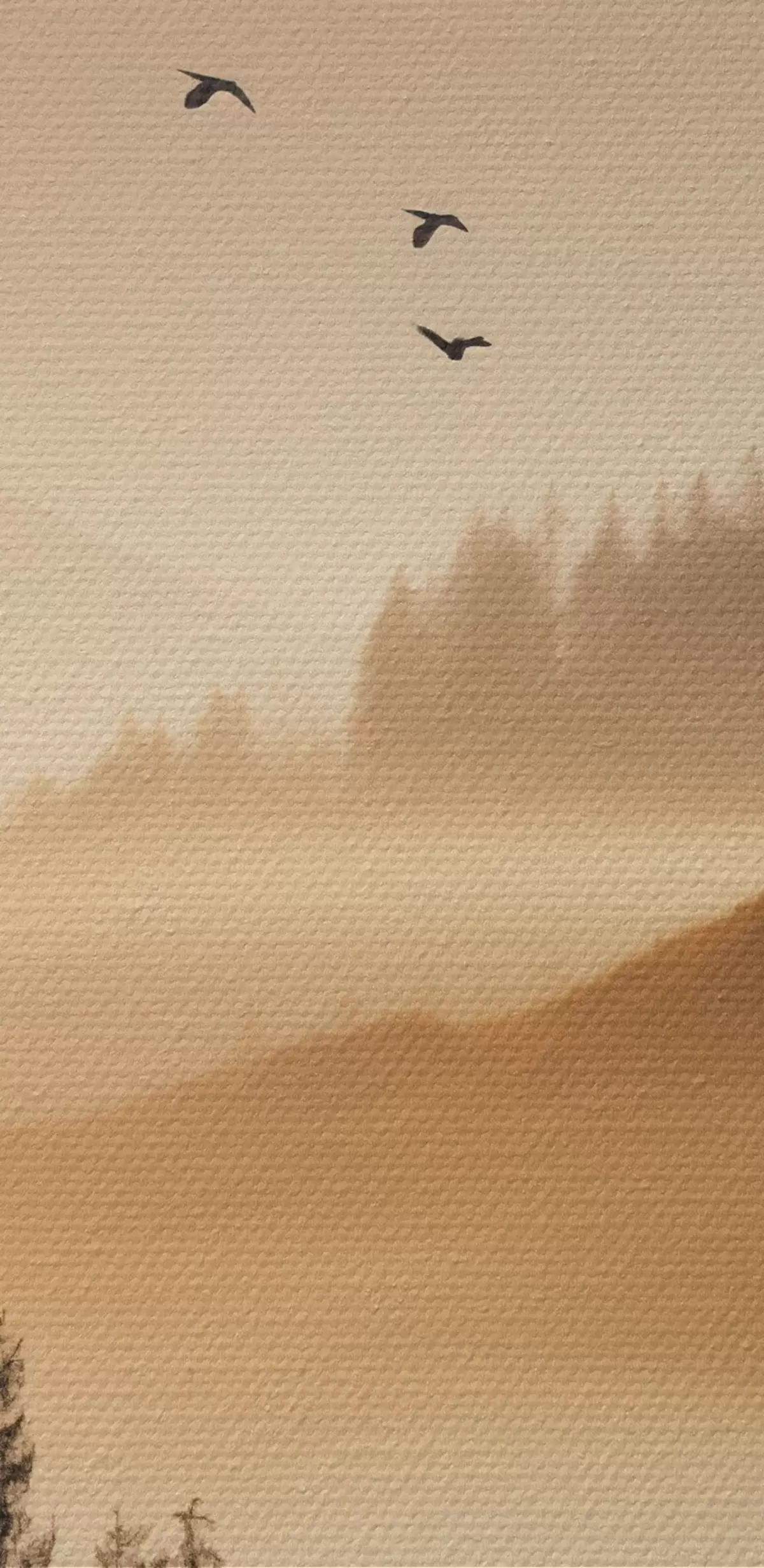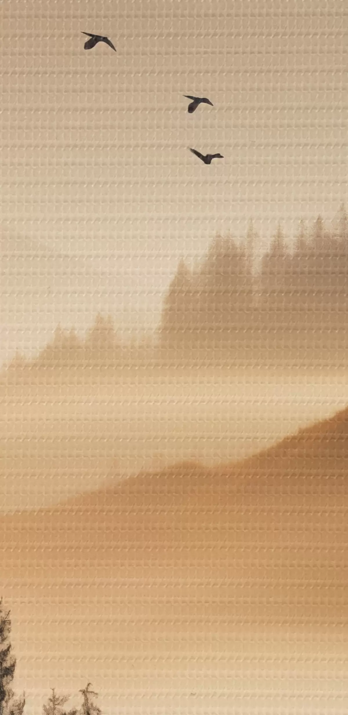 Картина Гірський пейзаж з лісом і птахами, що літають у небі, вкритий товстим шаром туману під час сходу сонця Арт. s45563