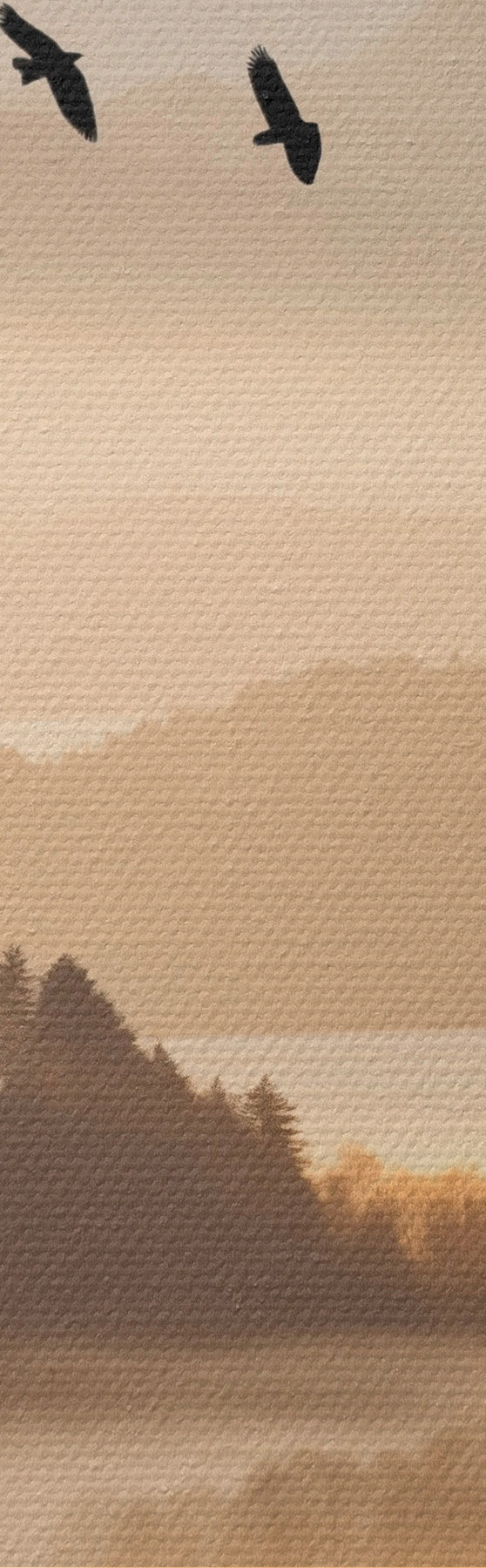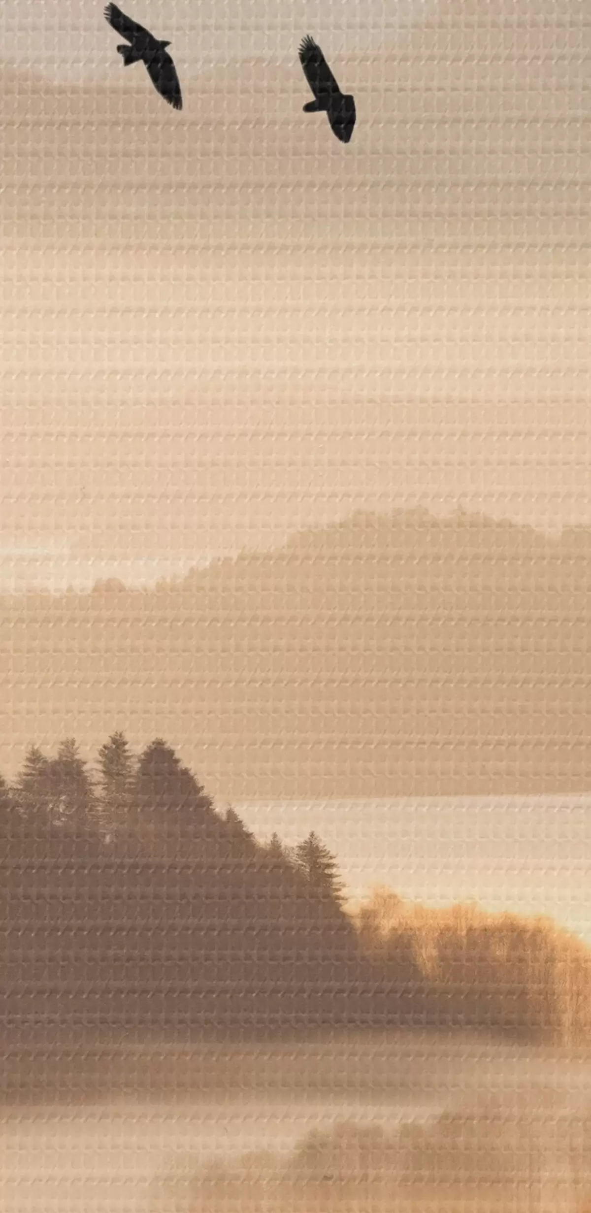 Картина Гірський пейзаж з лісом і птахами, що літають у небі, вкритий товстим шаром туману під час сходу сонця Арт. s45564