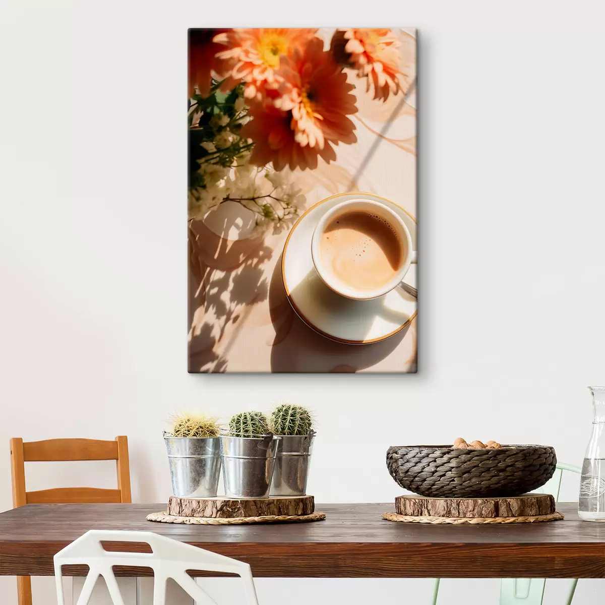Картина Чашка кави з пінкою на білій тарілці, квіти на задньому плані, сонячне світло s45570