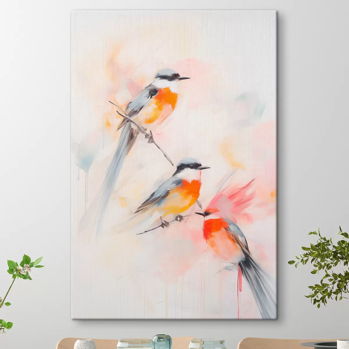 Картина Птахи на гілках, м'які пастельні кольори, світле тло з рожевими та білими відтінками Арт. s45577