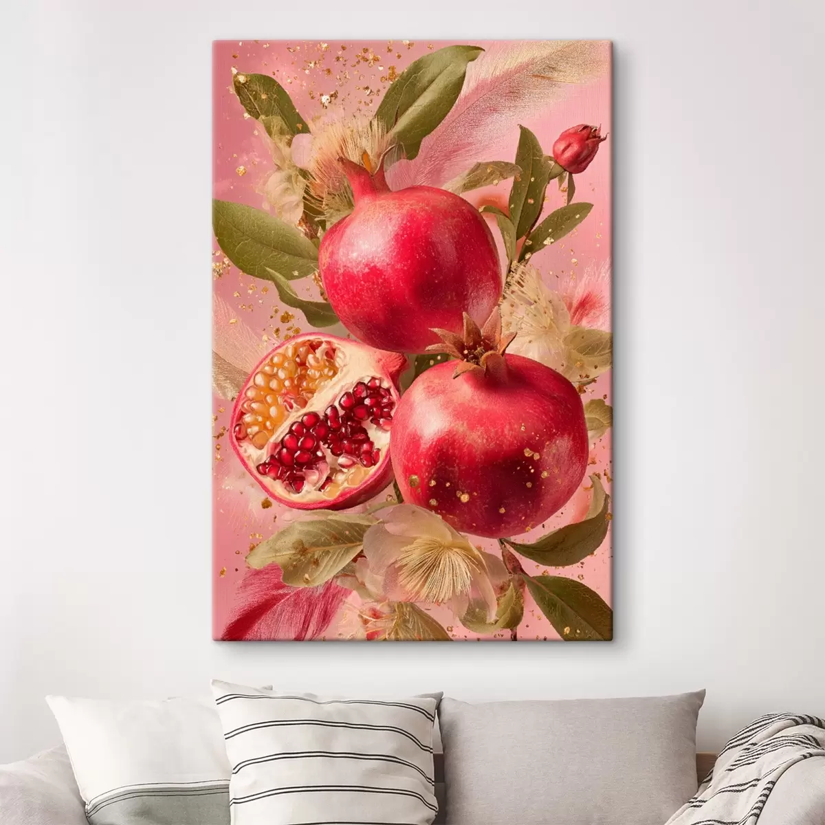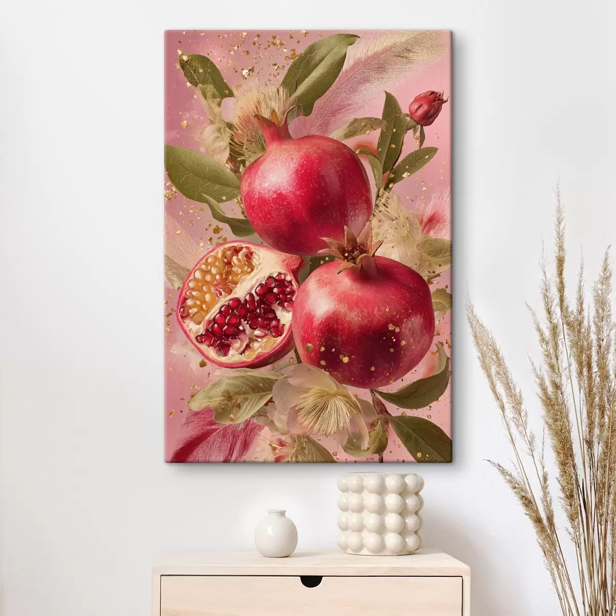 Картина Стиглі гранати на рожевому тлі з листям і золотистими цятками Арт. s45868