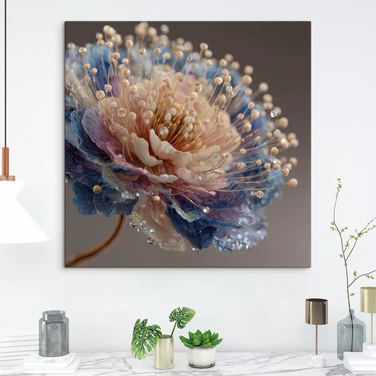 Картина Перламутровий квітка з краплями роси, персиково-блакитними пелюстками s45911