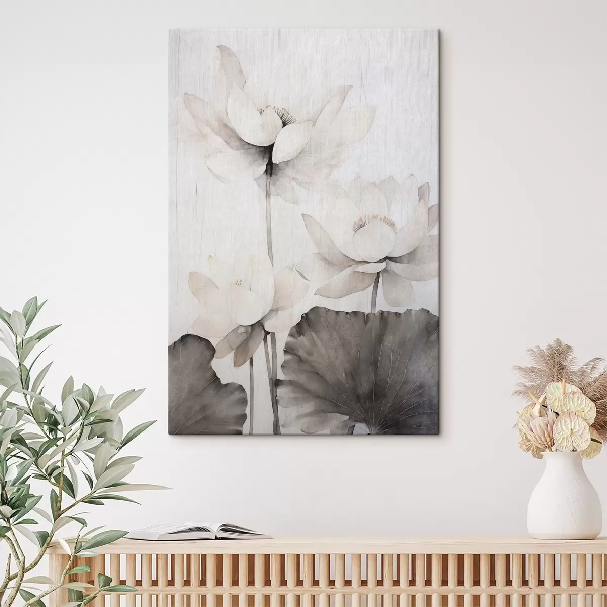 Картина Білі текстуровані квіти лотоса з темними листям, світлий фон, мінімалістичний дизайн s45936