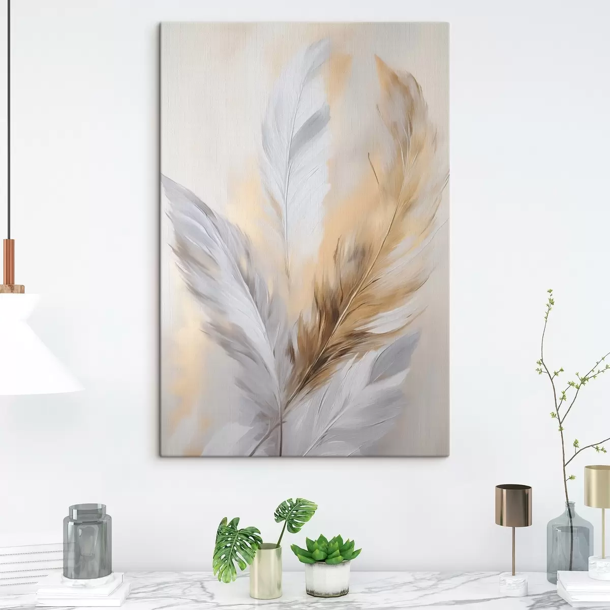 Картина Пір'я з помаранчевими акцентами, фактурна мінімалістична композиція, сучасне мистецтво Арт. s45945
