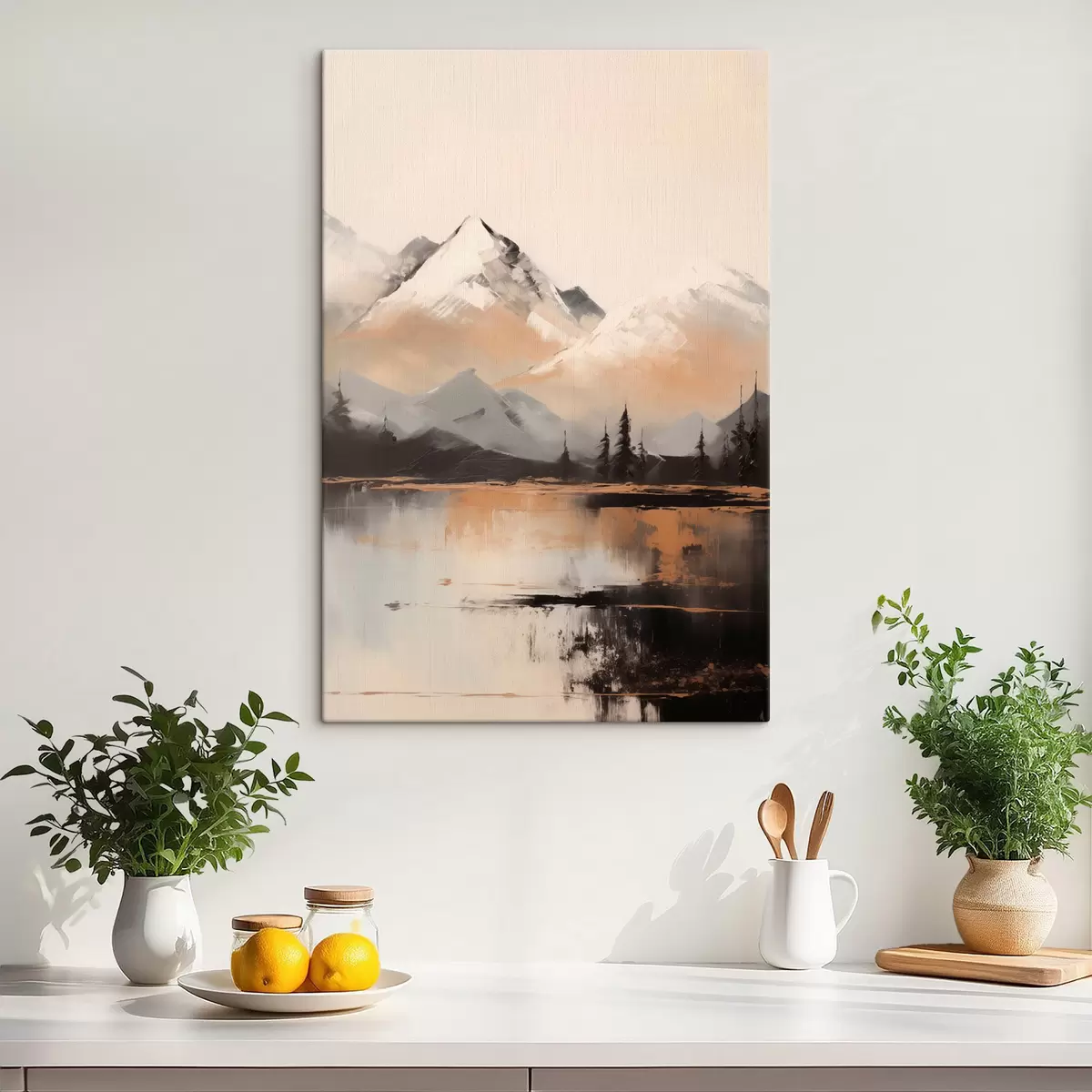 Картина Засніжені гори з текстурою та декількома деревами перед озером s45951
