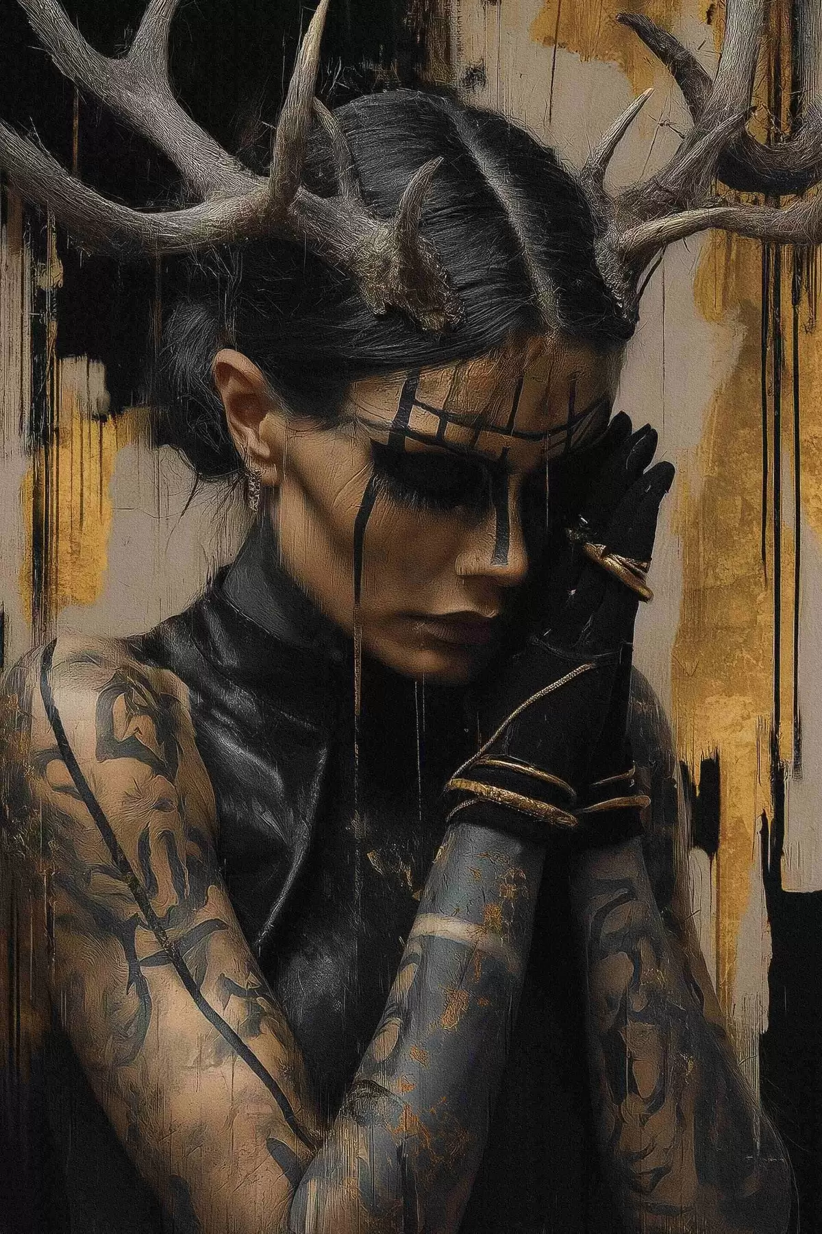 Картина Жінка з рогами в темному образі з чорними лініями на обличчі s46144