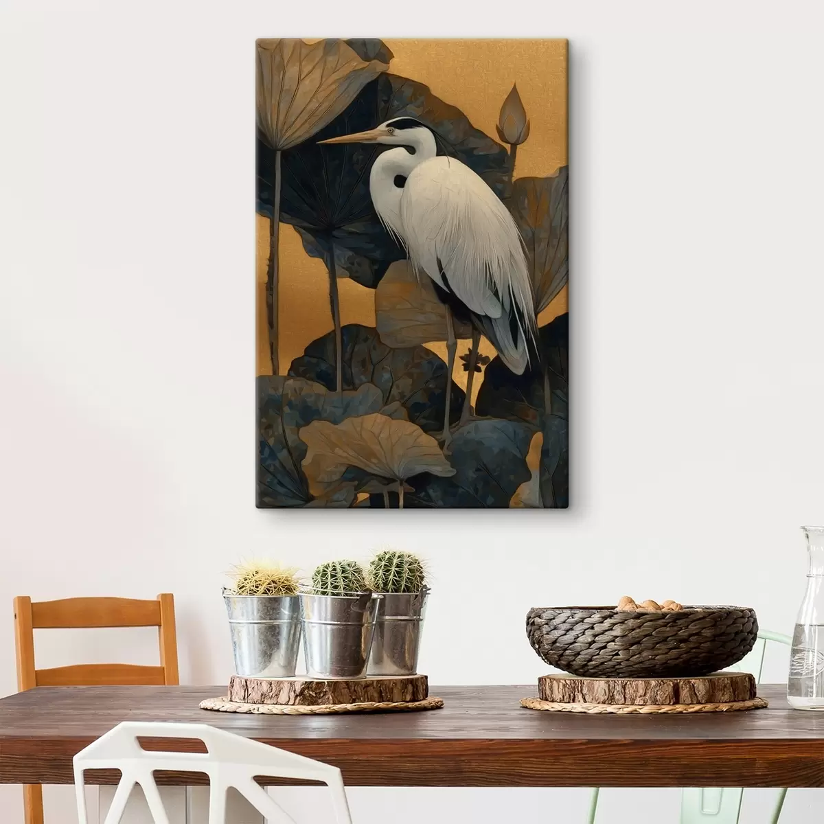 Картина Біла чапля серед великих листя на теплому тлі s46147