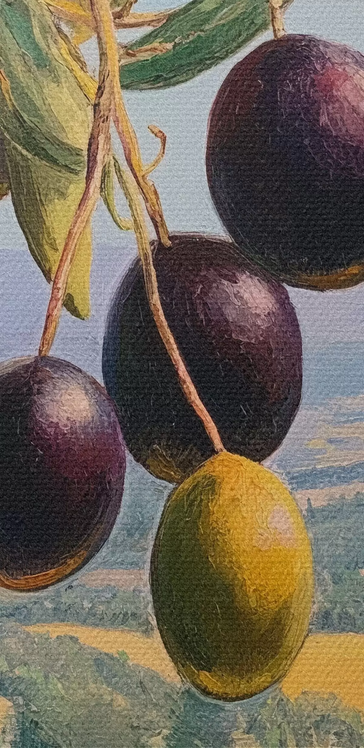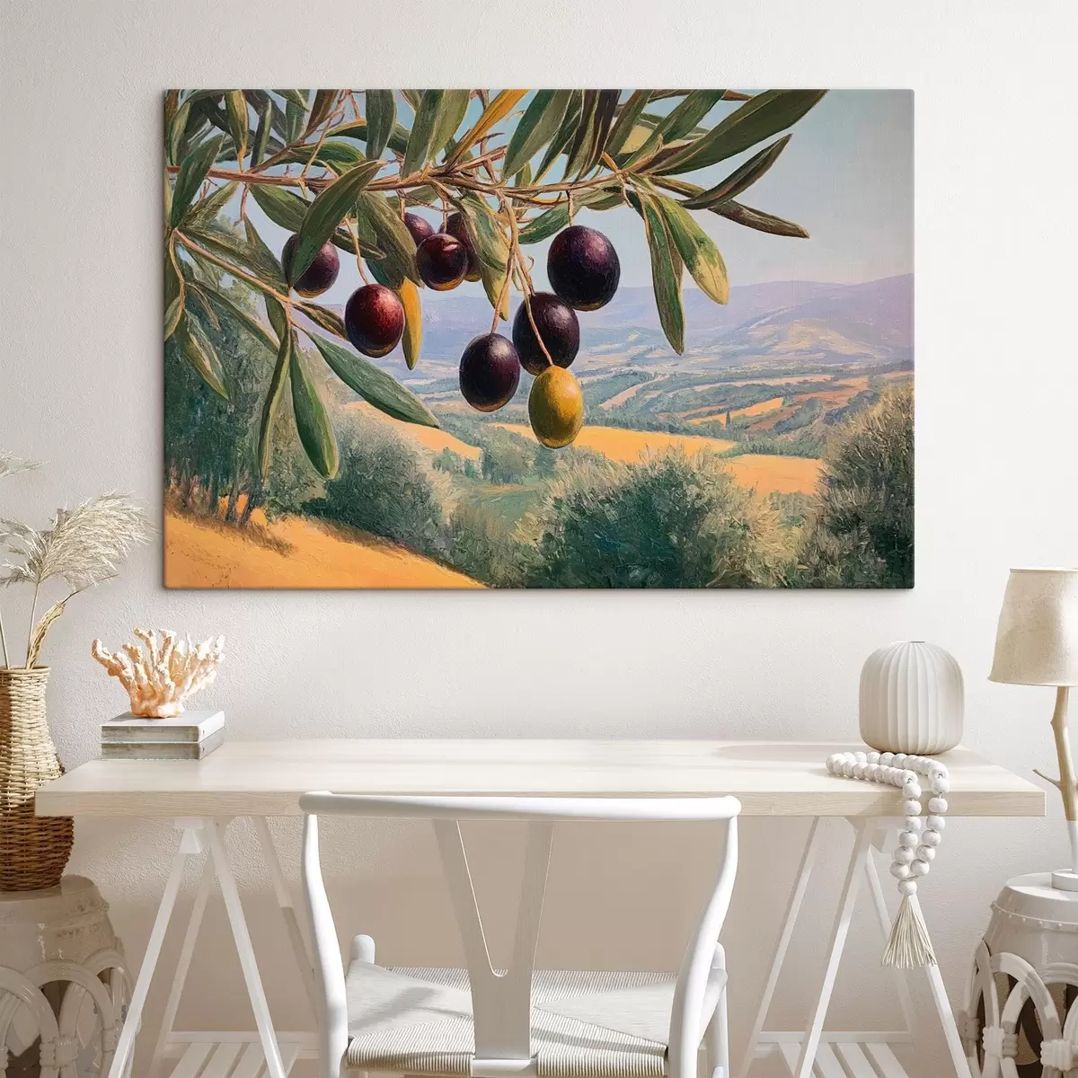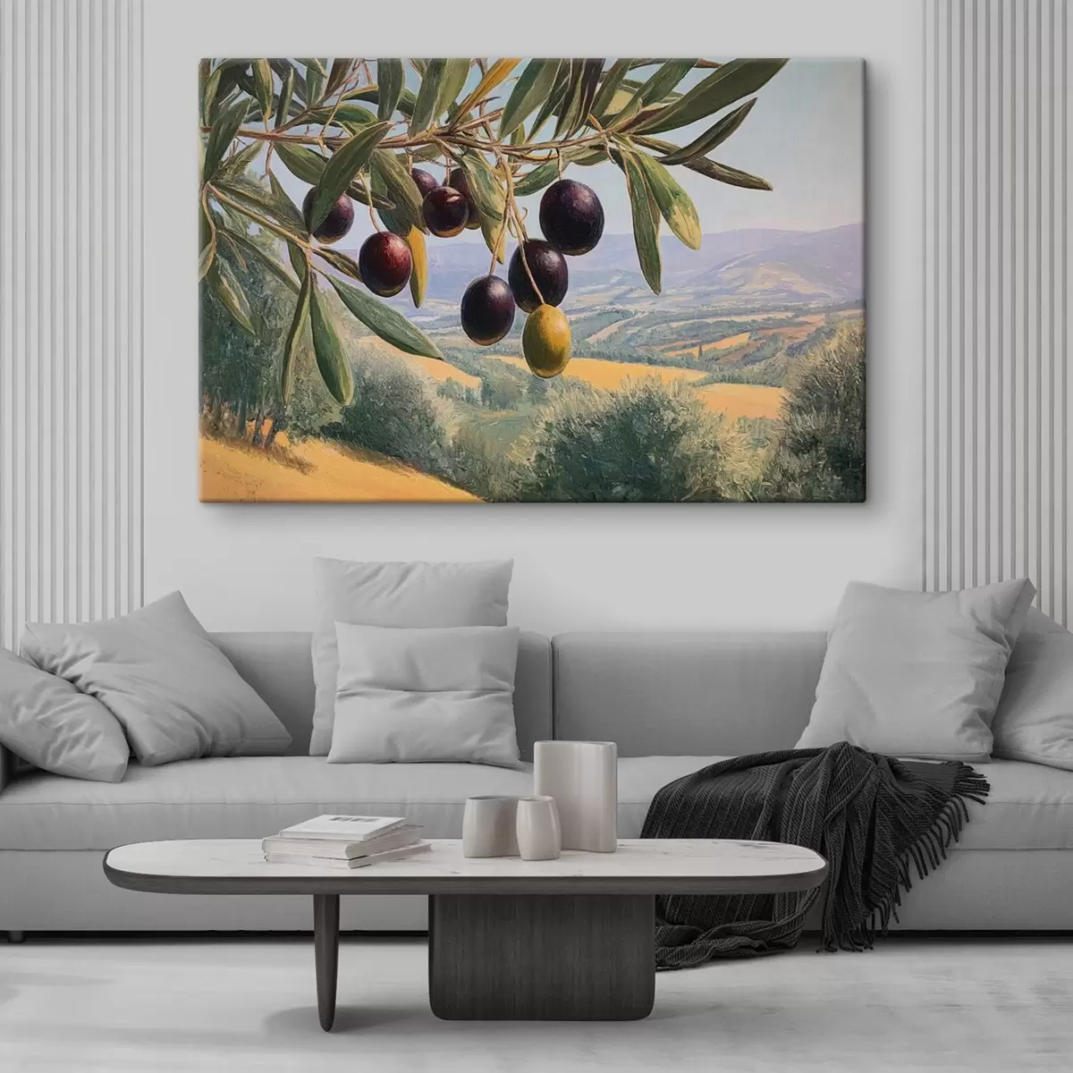 Картина Оливкова гілка з темними плодами на тлі літнього пейзажу Арт. s46150