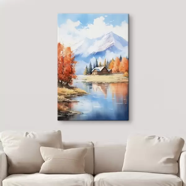 Картина Осінній пейзаж біля озера з будинком і горами s46184