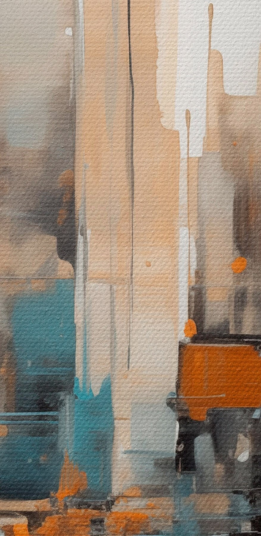 Картина Абстрактний міський пейзаж з помаранчевими, бірюзовими та коричневими вертикальними мазками та геометричними фігурами Арт. s46266