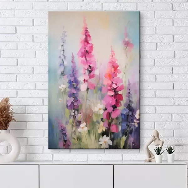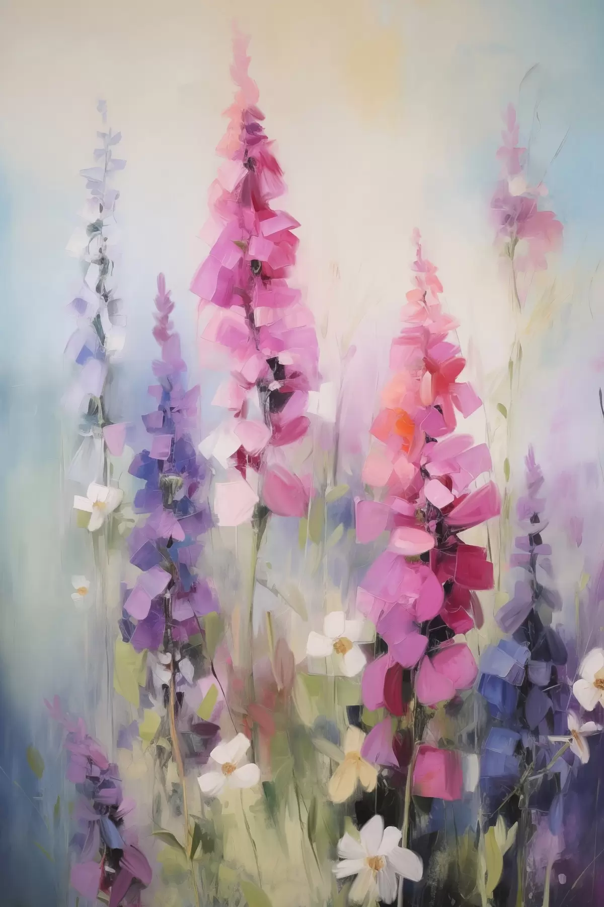 Картина Рожеві та фіолетові квіти з білими маргаритками на полі, м'які мазки пензля, пастельні кольори, імпресіоністичний стиль s46279