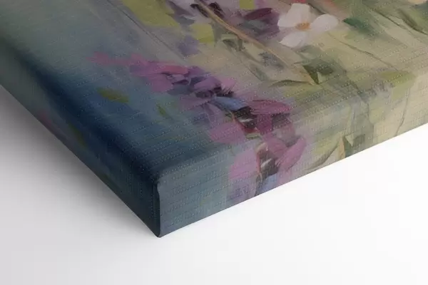 Картина Рожеві та фіолетові квіти з білими маргаритками на полі, м'які мазки пензля, пастельні кольори, імпресіоністичний стиль s46279