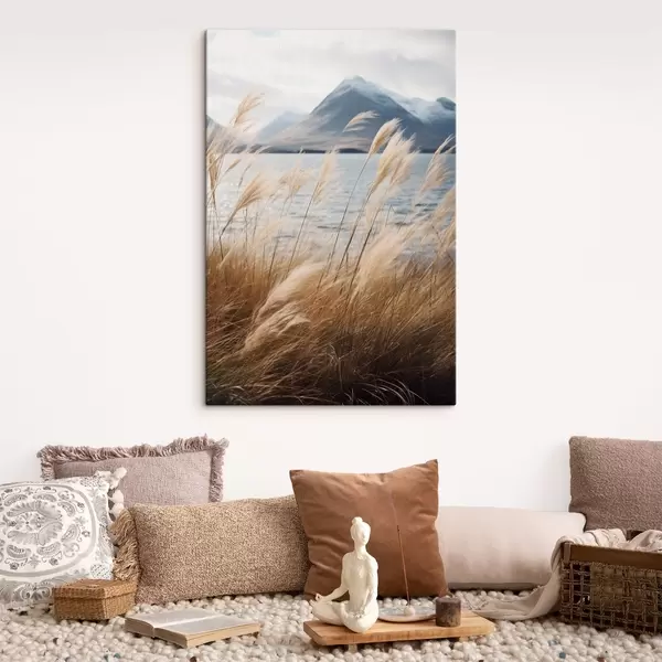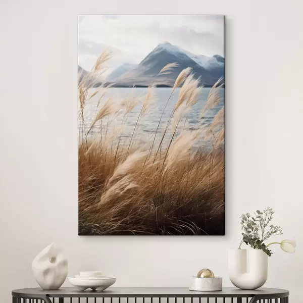Картина Трава пампас на тлі озера і гір, м'яке освітлення, приглушені кольори, натуралістичний стиль s46283
