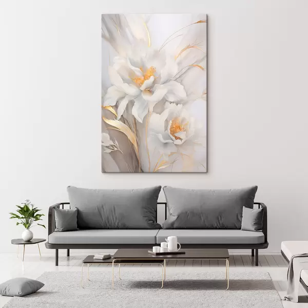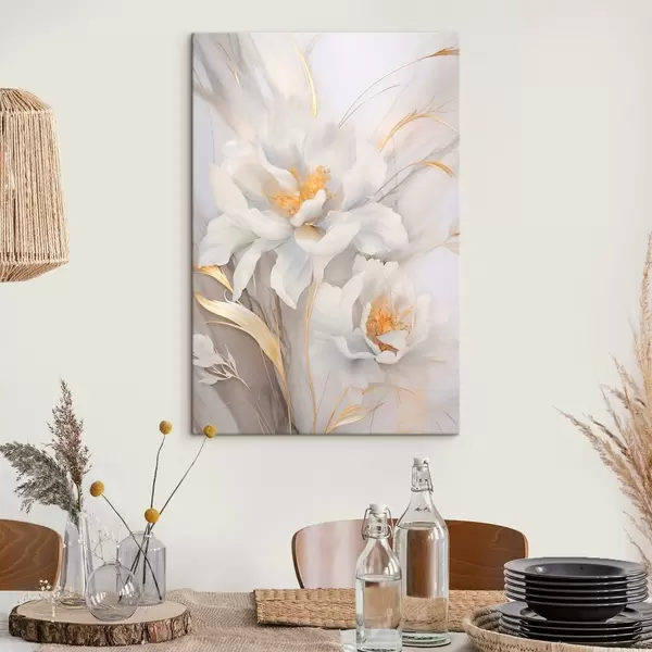 Картина Білі квіти з жовтими маточками і стеблами, ніжні пелюстки, витончена композиція, нейтральний фон Арт. s46293