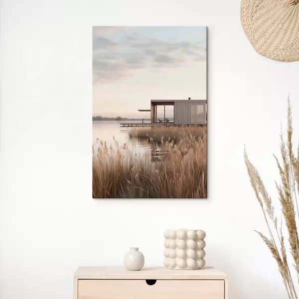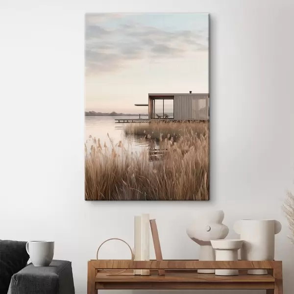 Картина Сучасна хатина на березі озера серед очерету в м'якому сутінку Арт. s46513