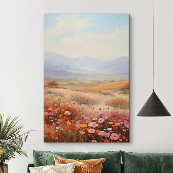 Картина Пейзаж, поле з барвистими квітами на тлі гір, м'які пастельні кольори Арт. s46685