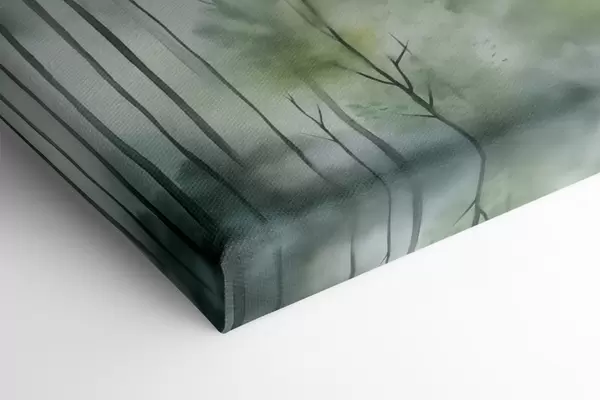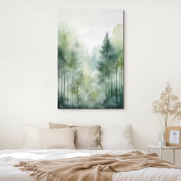 Картина Акварельний малюнок, що імітує туманний ліс з високими соснами та горами на задньому плані s46690
