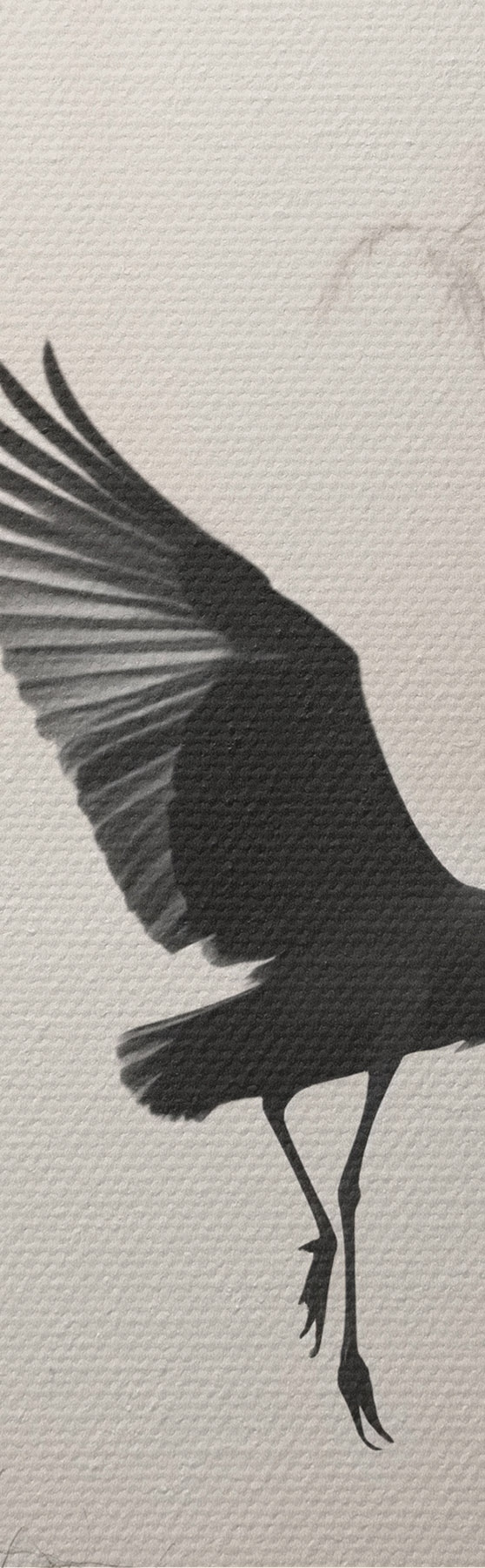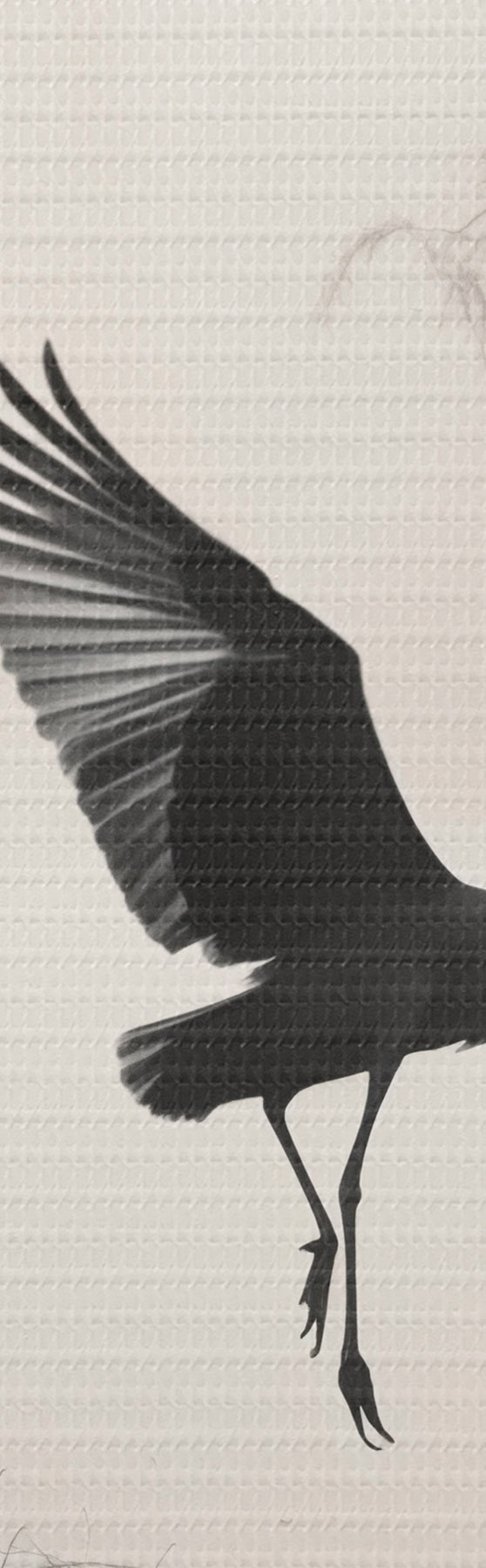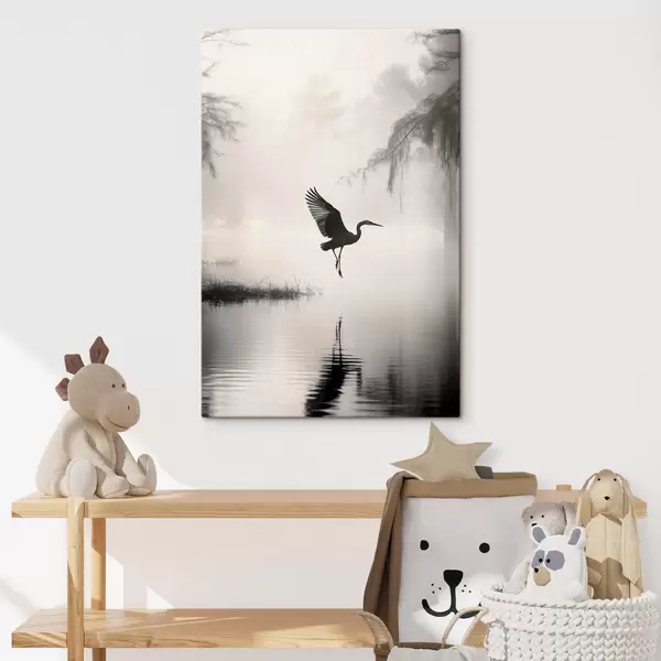 Картина Біла чапля з розпростертими крилами, що летить біля високих очеретів, чорно-біла мінімалістична композиція Арт. s46694