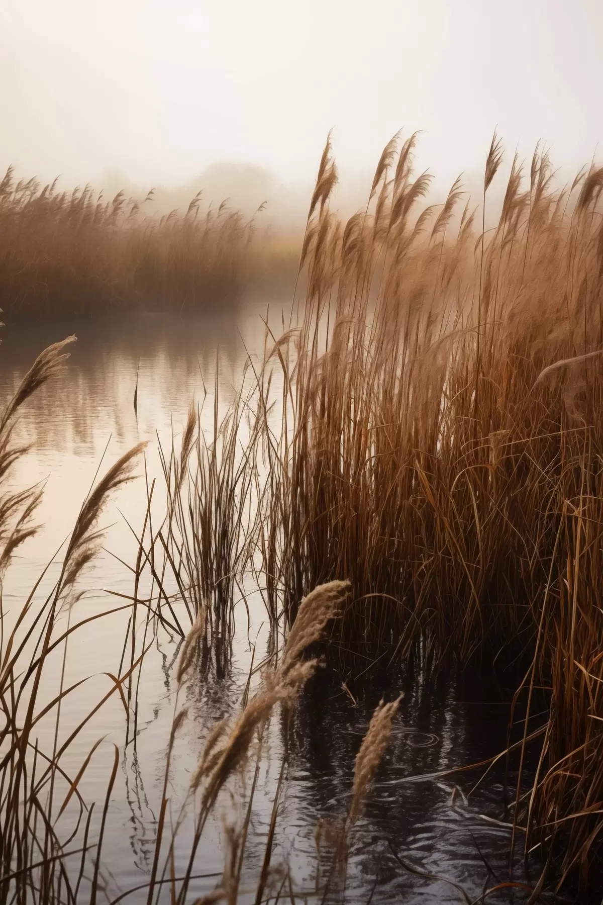 Картина Високі очерети, що ростуть у водоймі, вода відбиває очерети, туманний фон, м'яке світло, природний пейзаж s46695