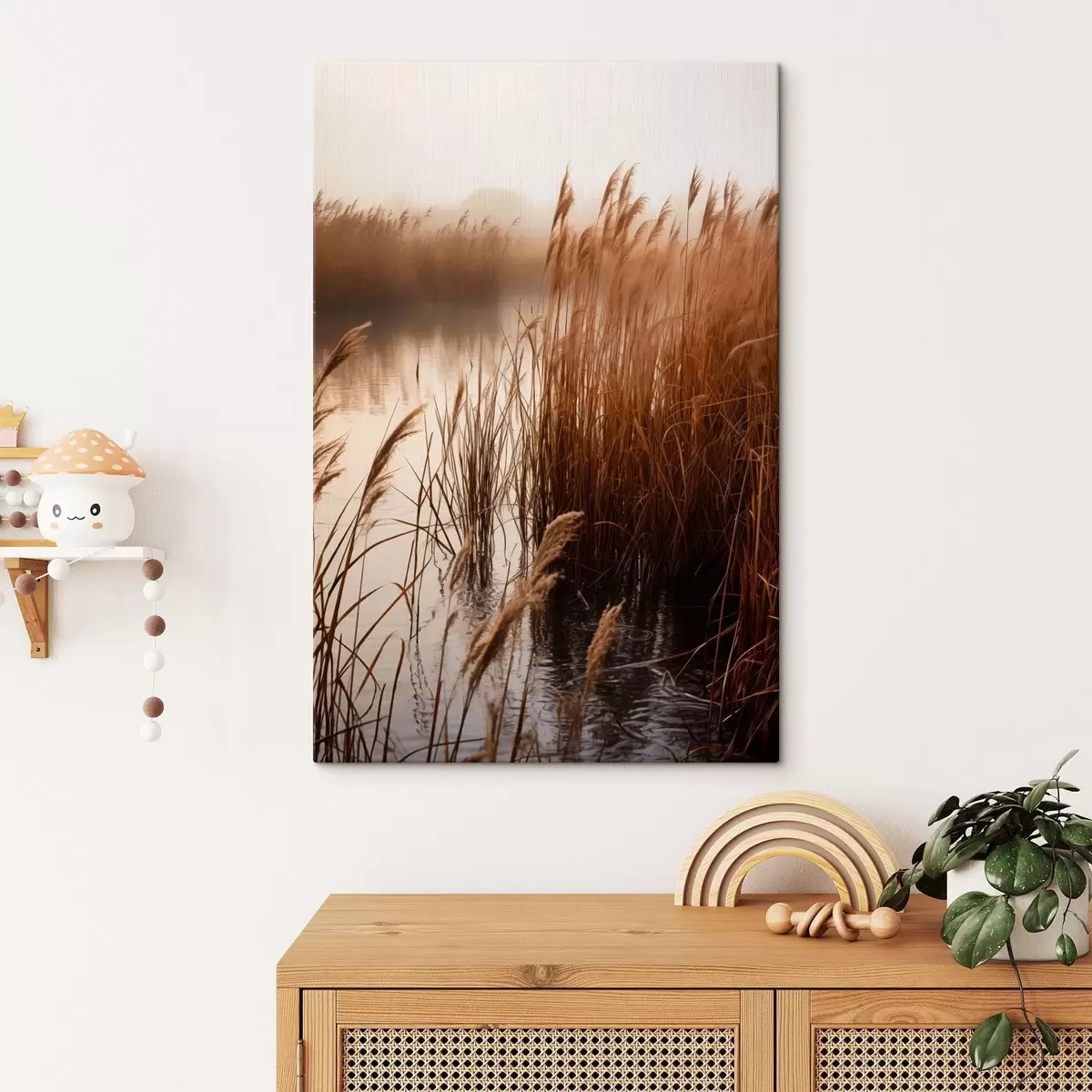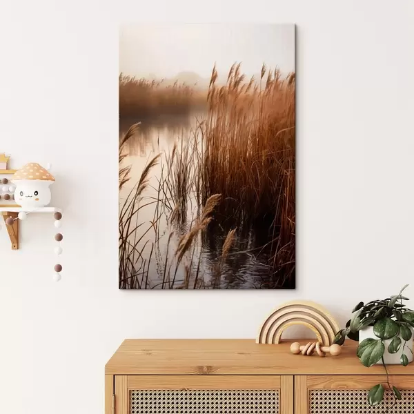 Картина Високі очерети, що ростуть у водоймі, вода відбиває очерети, туманний фон, м'яке світло, природний пейзаж Арт. s46695