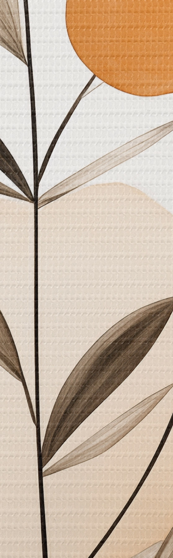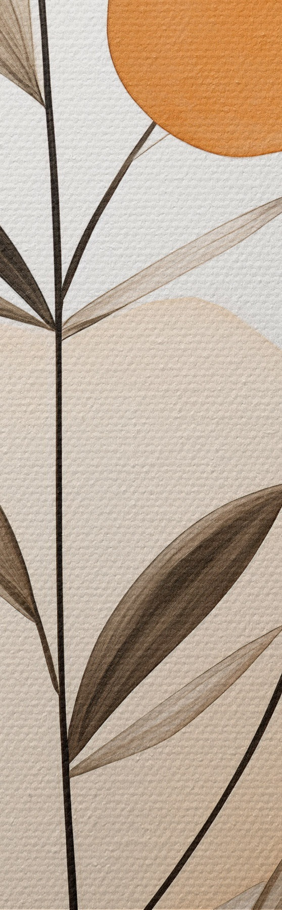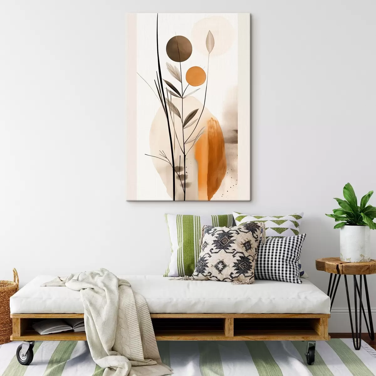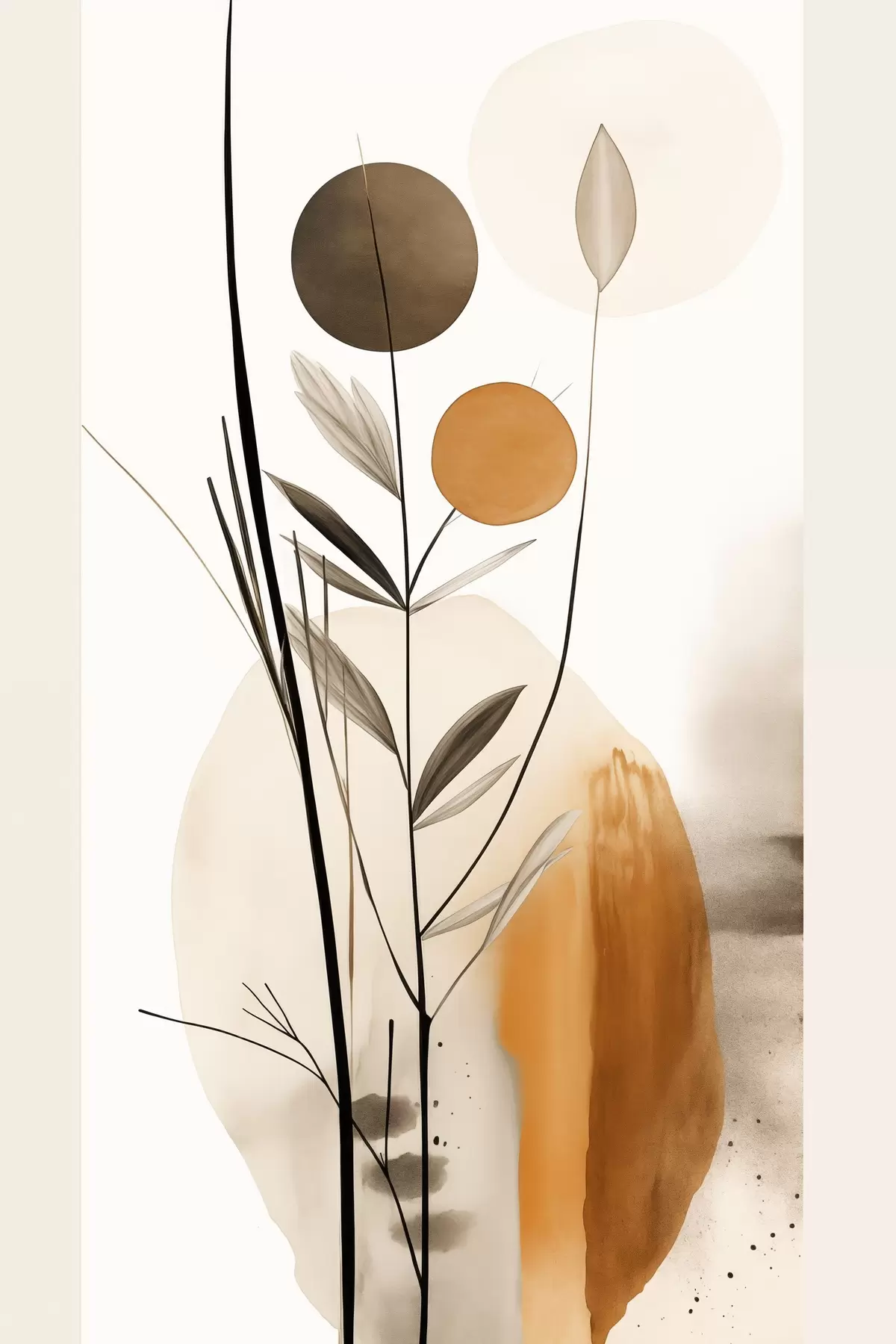 Картина Абстрактна імітація живопису з помаранчевими та сірими колами, листям і гілками, сучасний стиль, ефект акварелі Арт. s46698