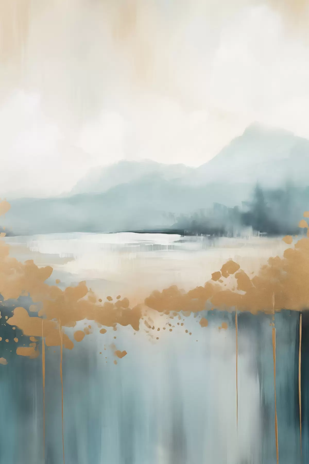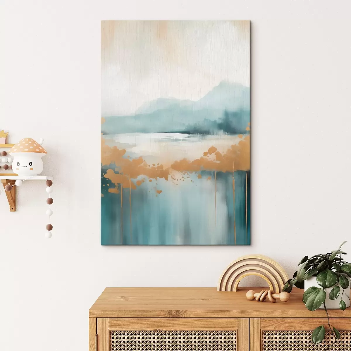 Картина Абстрактний пейзаж з горами та озером у кольорах бірюзового та текстурованого жовтого, м'які мазки пензлем, мінімалістичне мистецтво Арт. s46703
