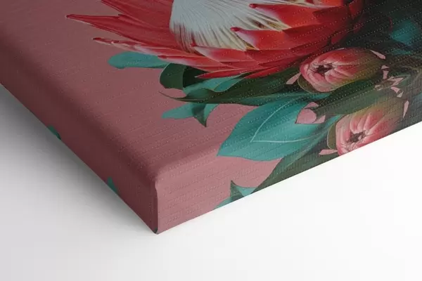 Картина Букет протеї з червоними пелюстками і зеленим листям на рожевому тлі s46946