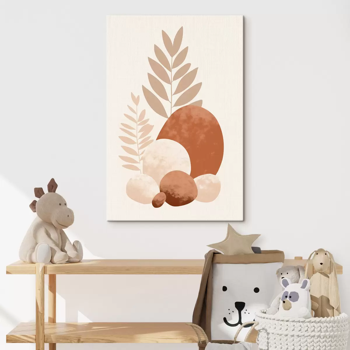 Картина Абстрактні форми, текстуровані камені та листя в приглушених персикових і теракотових тонах, мінімалістичний кремовий фон s47013