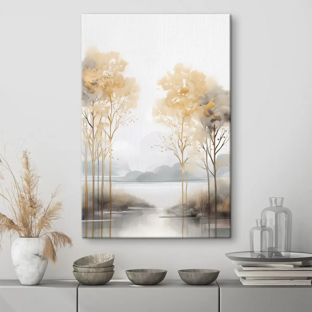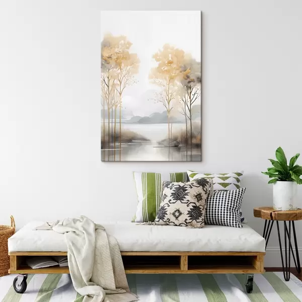Картина Декоративний абстрактний пейзаж, високі дерева з жовтим листям, річка і туман на задньому плані s47015