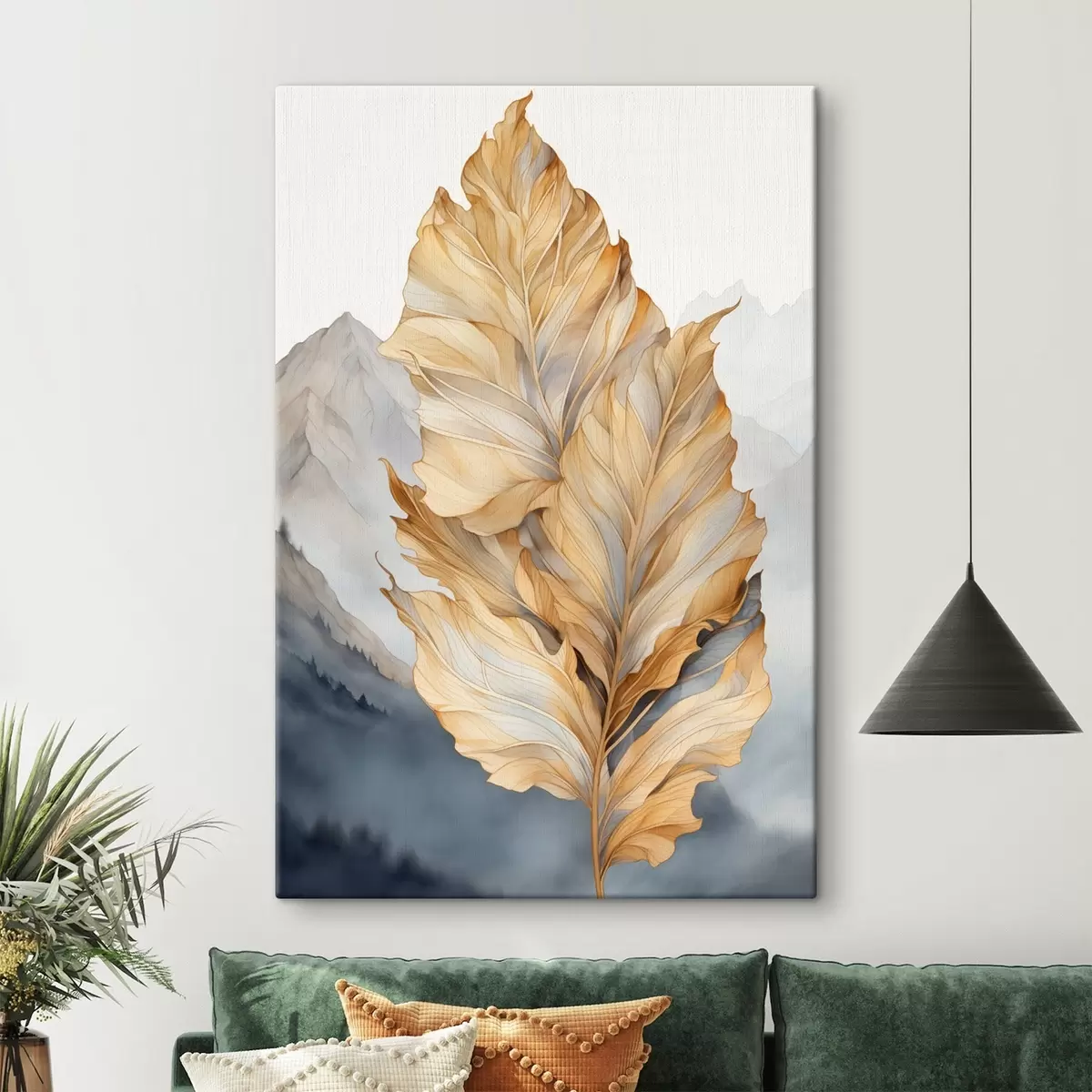 Картина Абстрактні великі жовті та коричневі листя зі складними деталями на тлі гірського пейзажу s47022