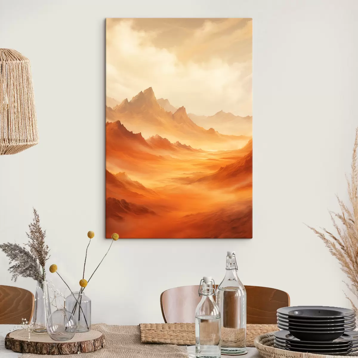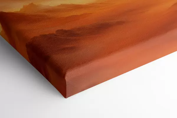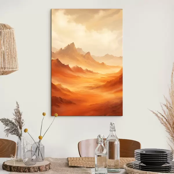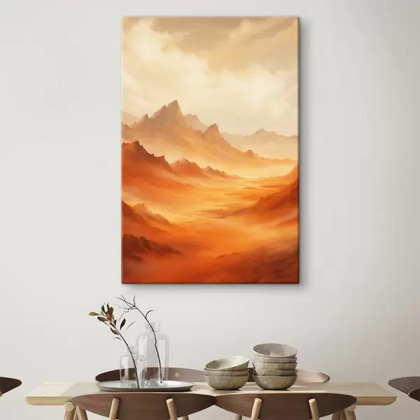 Картина Величезний помаранчевий пустельний ландшафт з високими скелястими горами під туманним, сонячним небом з рідкими хмарами Арт. s47029