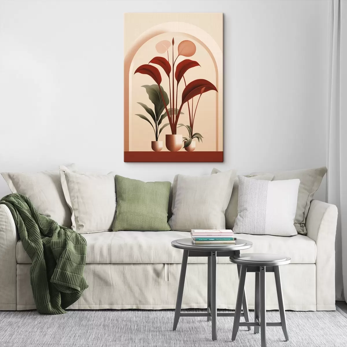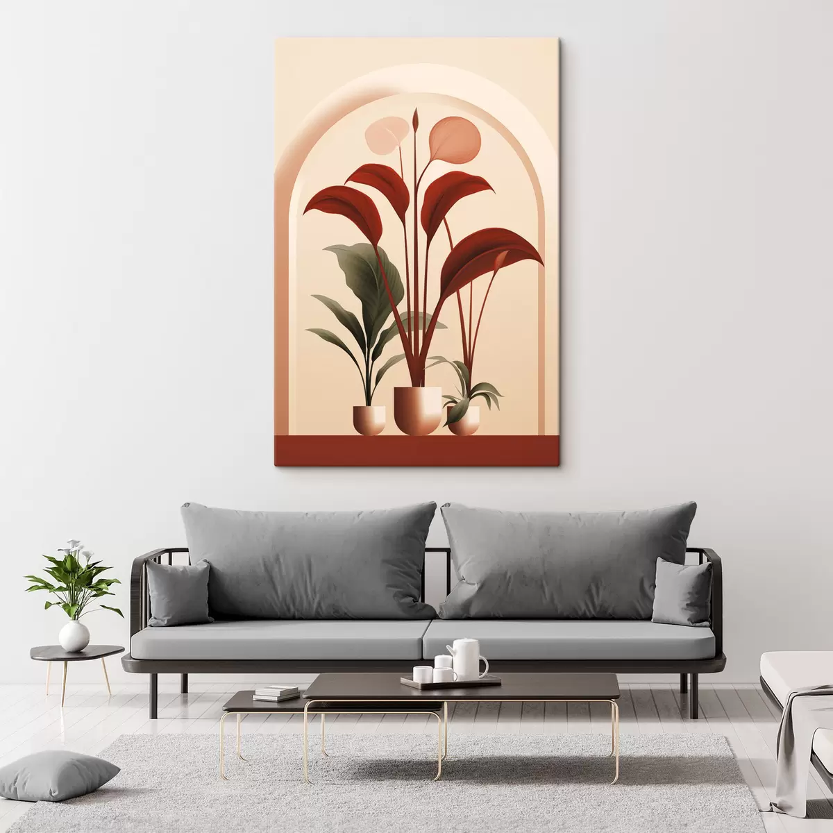 Картина Абстрактні рослини в горщиках з великими зеленими і червоними листям перед кремовою аркою Арт. s47033