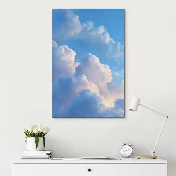 Картина Об'ємні хмари в м'якій блакитно-рожевій палітрі в стилі фотореалістичної цифрової графіки s47088