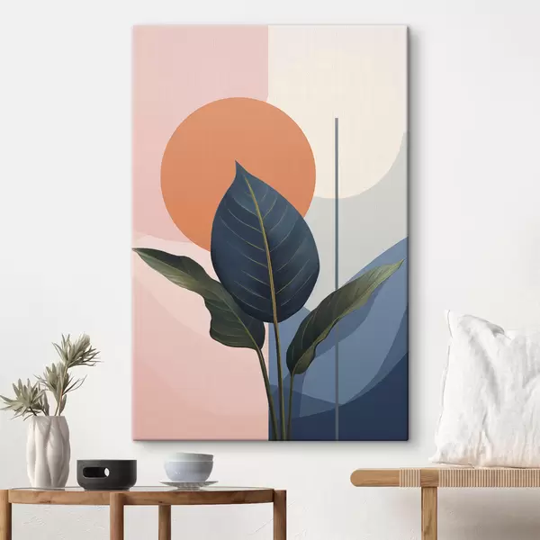 Картина Темне листя на тлі абстрактних фігур персикового та сірого кольорів з помаранчевим колом Арт. s47425