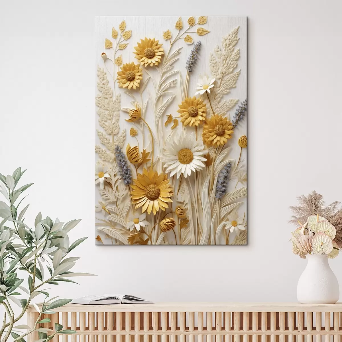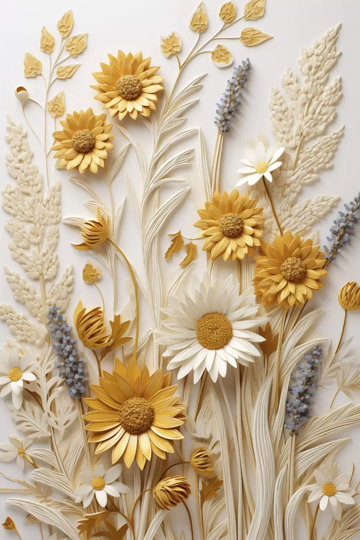 Картина Текстурована колекція жовтих і білих маргариток із сухими травами та гілочками лаванди на білому тлі Арт. s47430