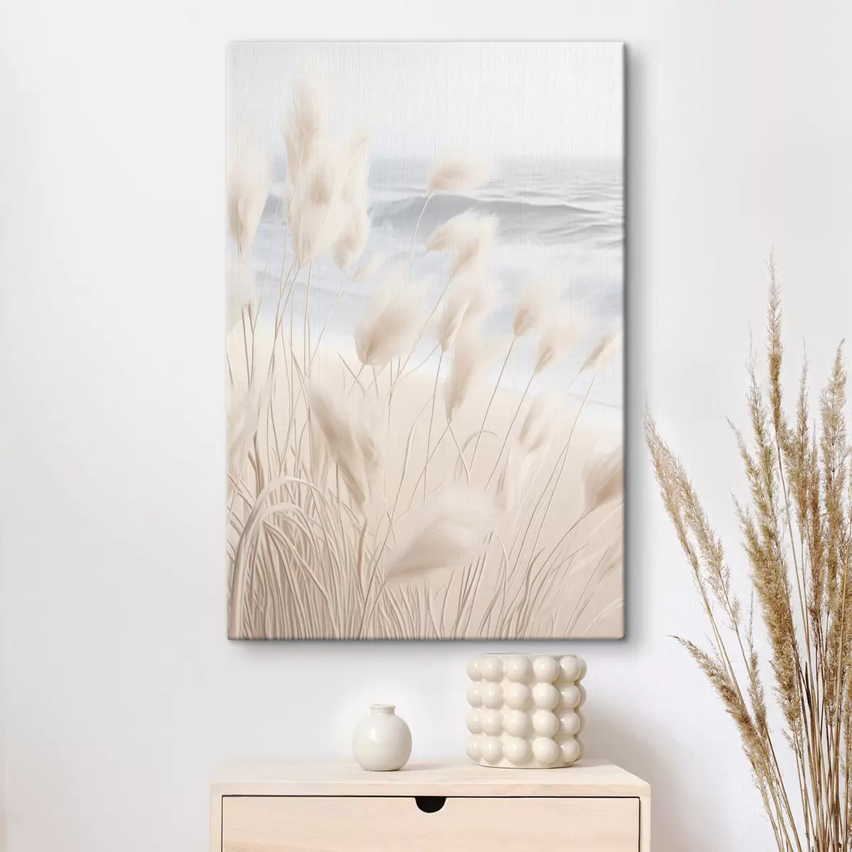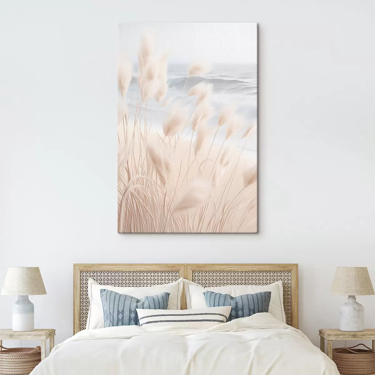 Картина Висока, пухнаста трава пампасу в м'яких бежевих тонах на передньому плані, з піщаним пляжем на задньому плані s47432