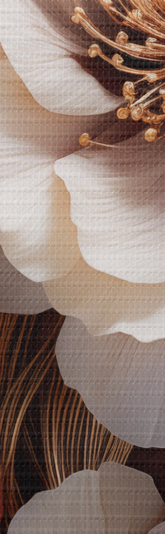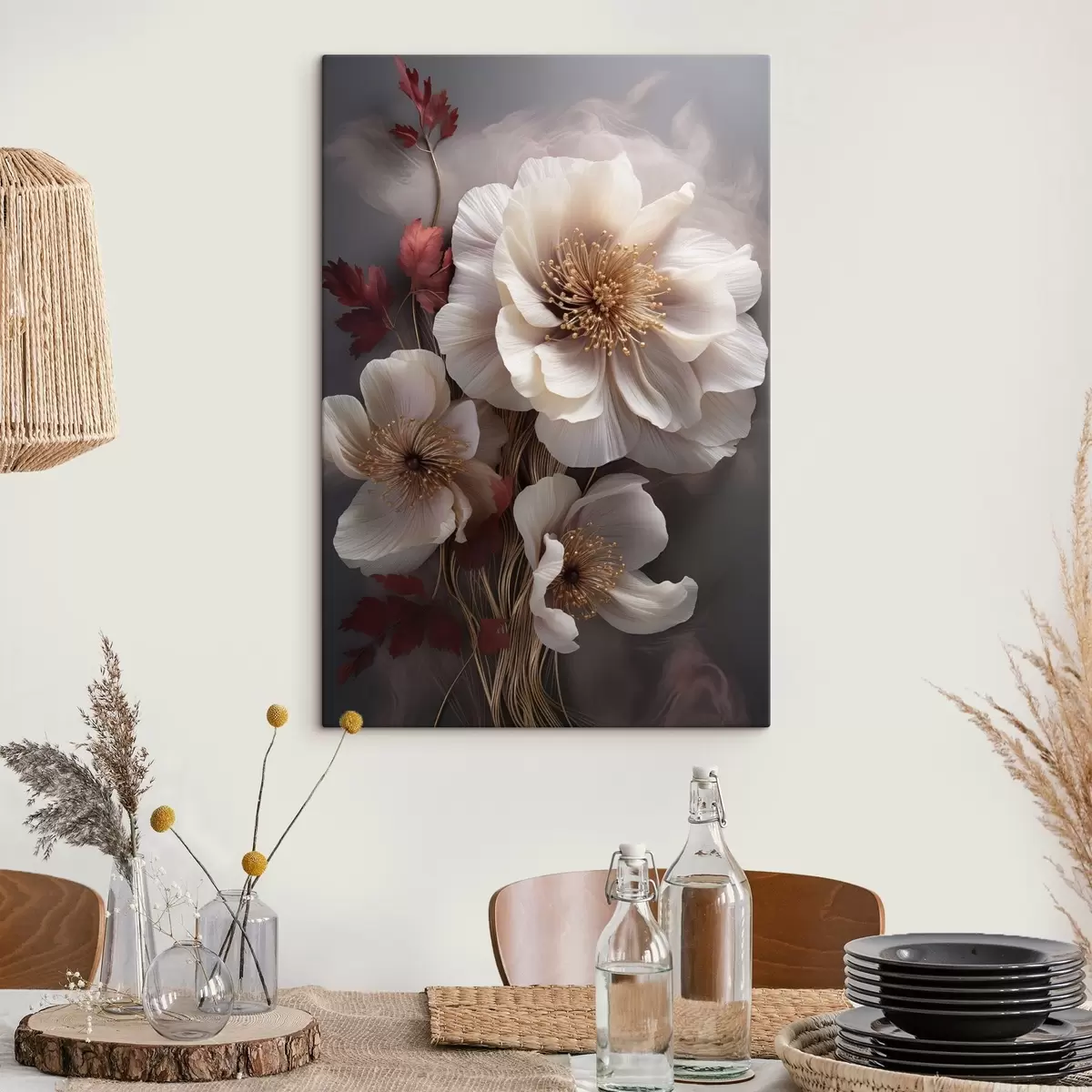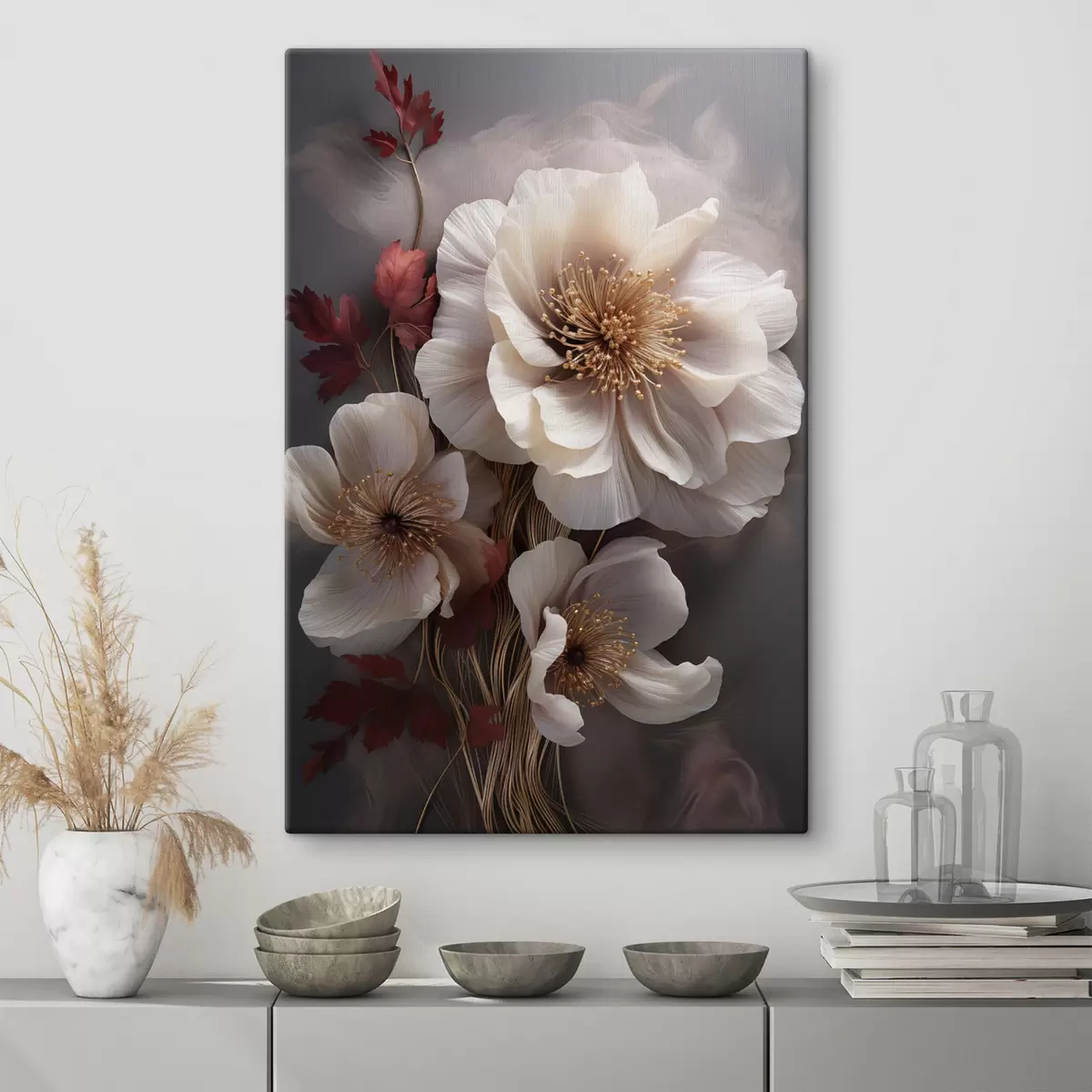 Картина Ніжні півонії з тонкими, легкими пелюстками, оточені темно-червоним листям на абстрактному тлі Арт. s47434