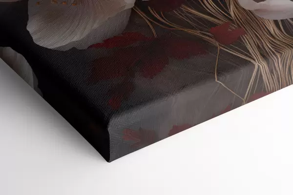 Картина Ніжні півонії з тонкими, легкими пелюстками, оточені темно-червоним листям на абстрактному тлі Арт. s47434