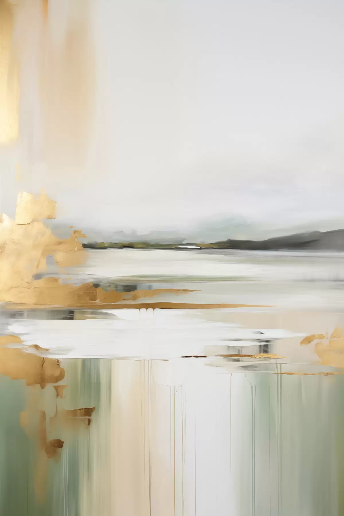 Картина Абстрактний пейзаж з жовтими та зеленими відтінками, вода, що відбиває небо та далекі гори, бліде, туманне небо s47438