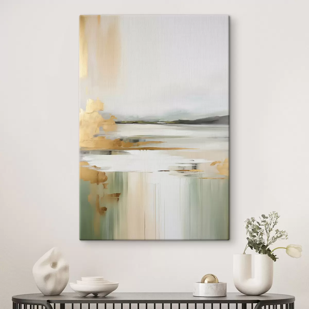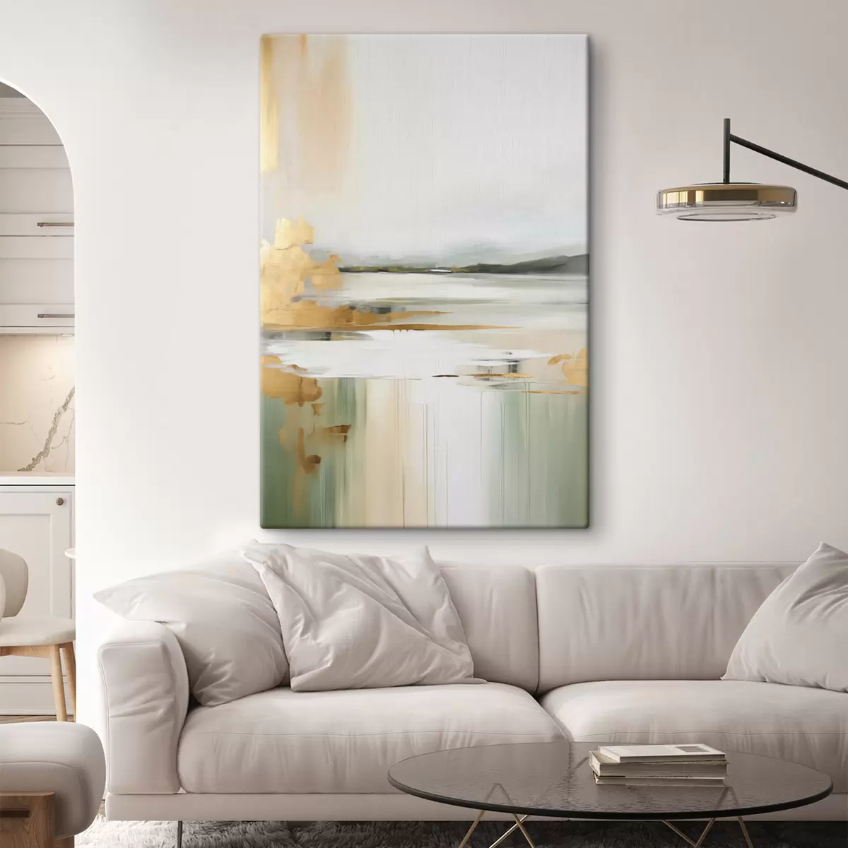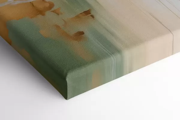 Картина Абстрактний пейзаж з жовтими та зеленими відтінками, вода, що відбиває небо та далекі гори, бліде, туманне небо Арт. s47438
