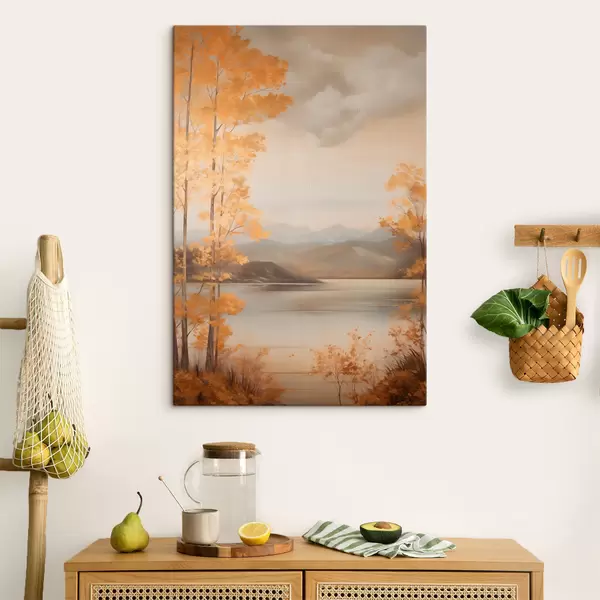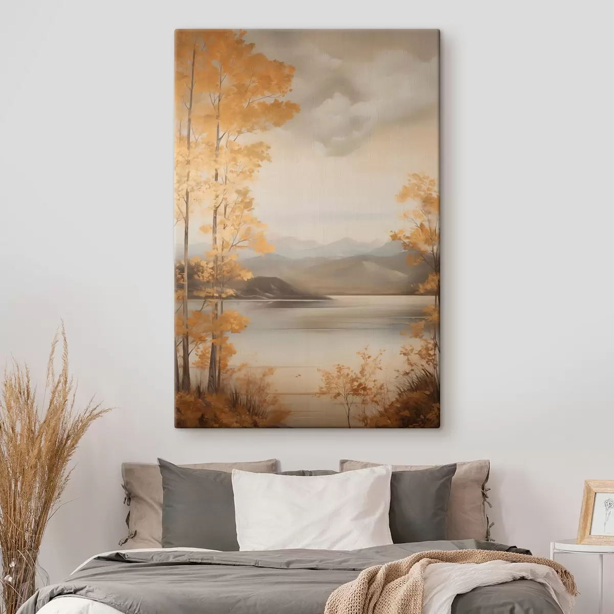 Картина Осінні дерева з помаранчевим листям обрамляють спокійне озеро з далекими горами під хмарним небом. s47441