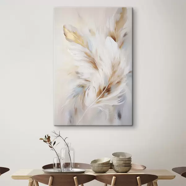 Картина Великі м'які пір'я з поєднанням білих, жовтих і коричневих відтінків на світлому абстрактному тлі s47442