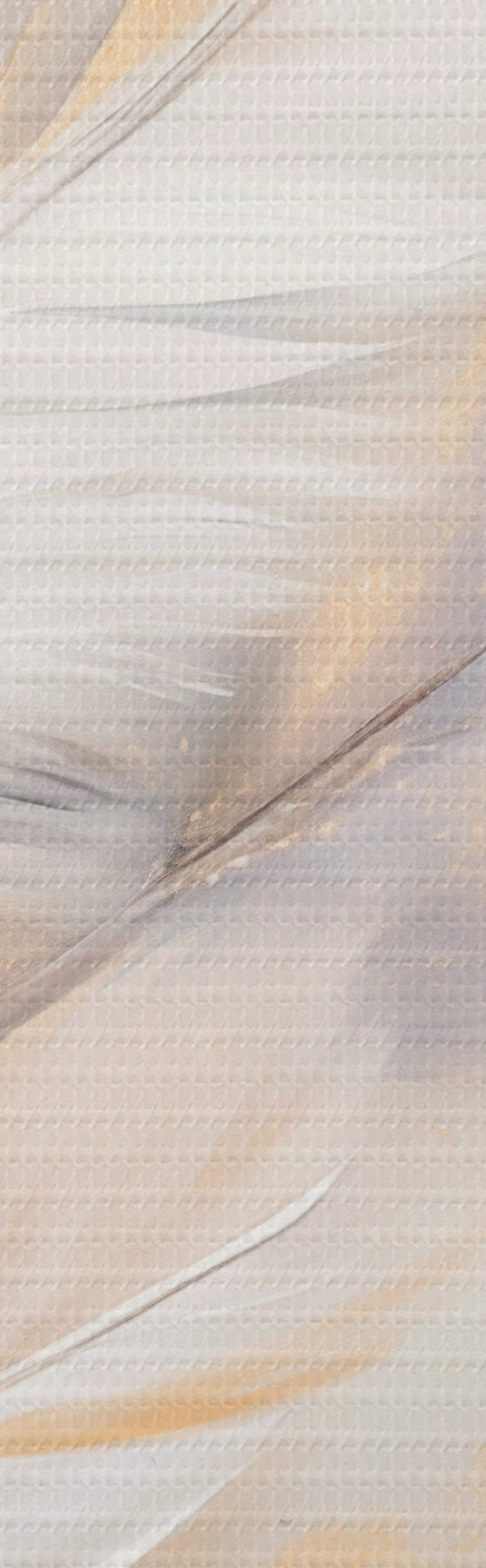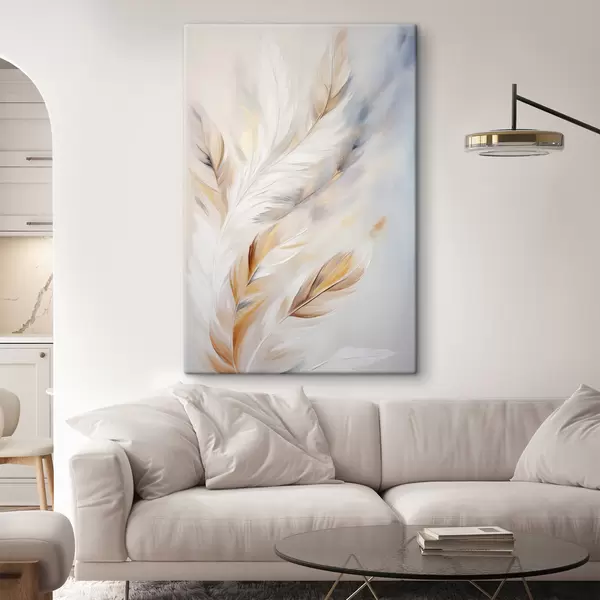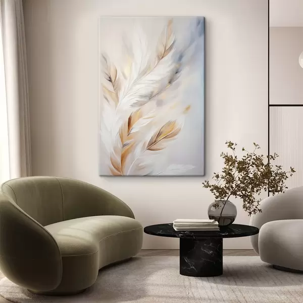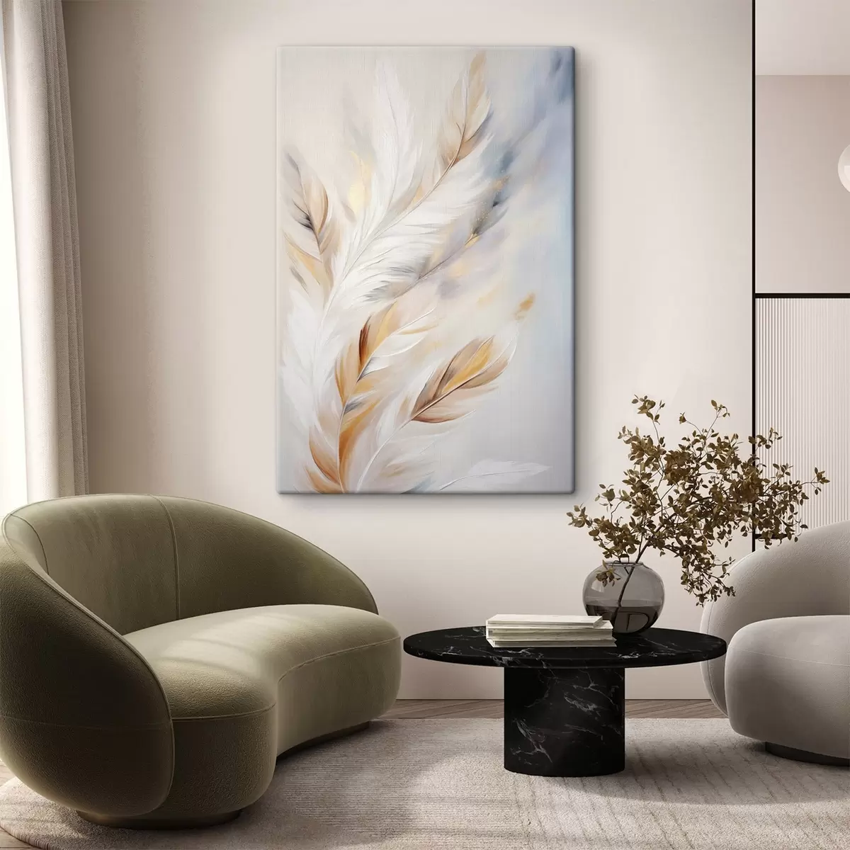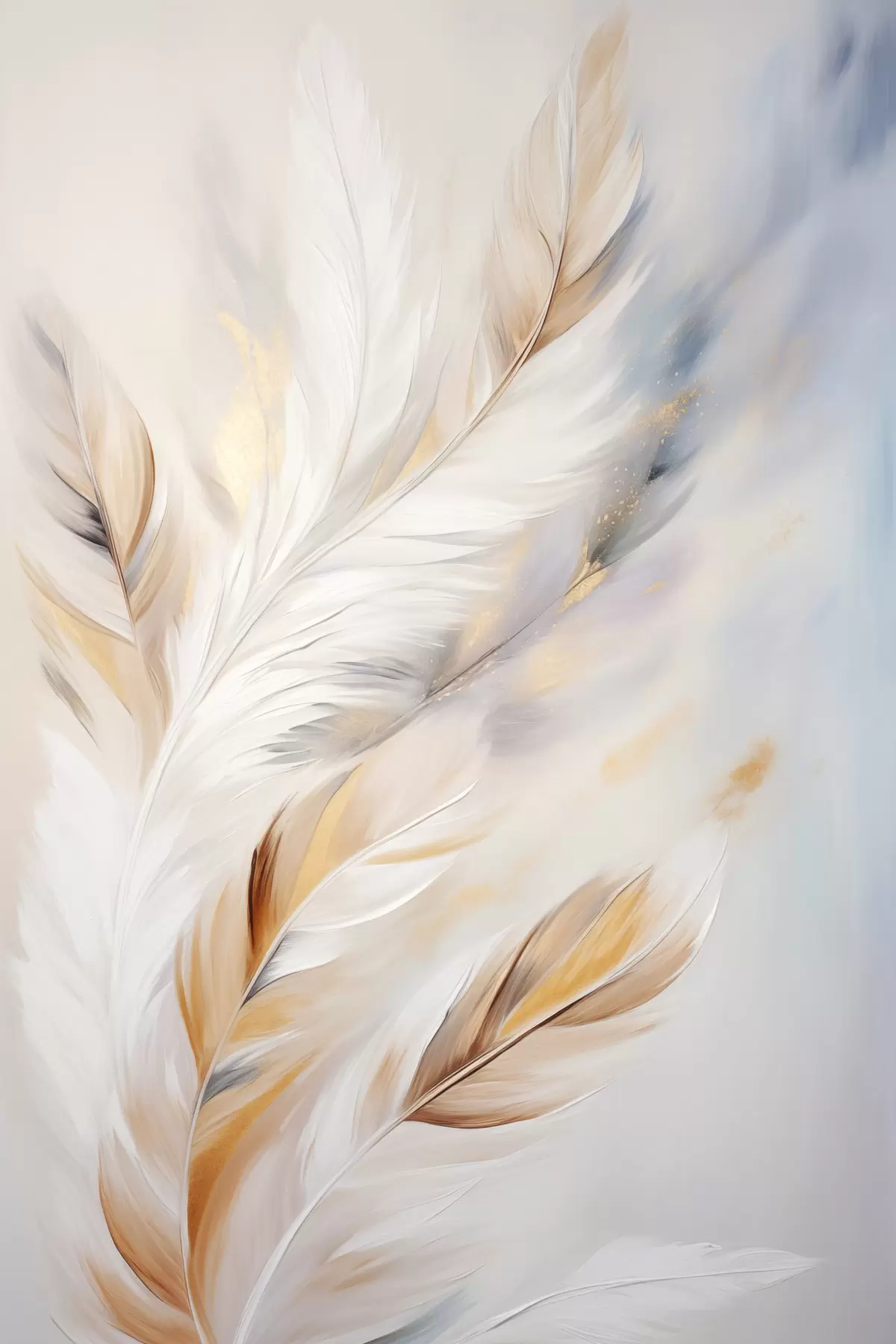 Картина Великі м'які пір'я з поєднанням білих, жовтих і коричневих відтінків на світлому абстрактному тлі s47443