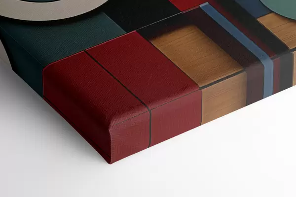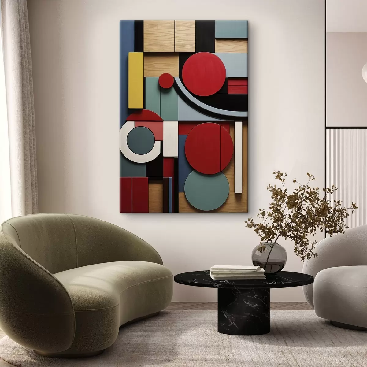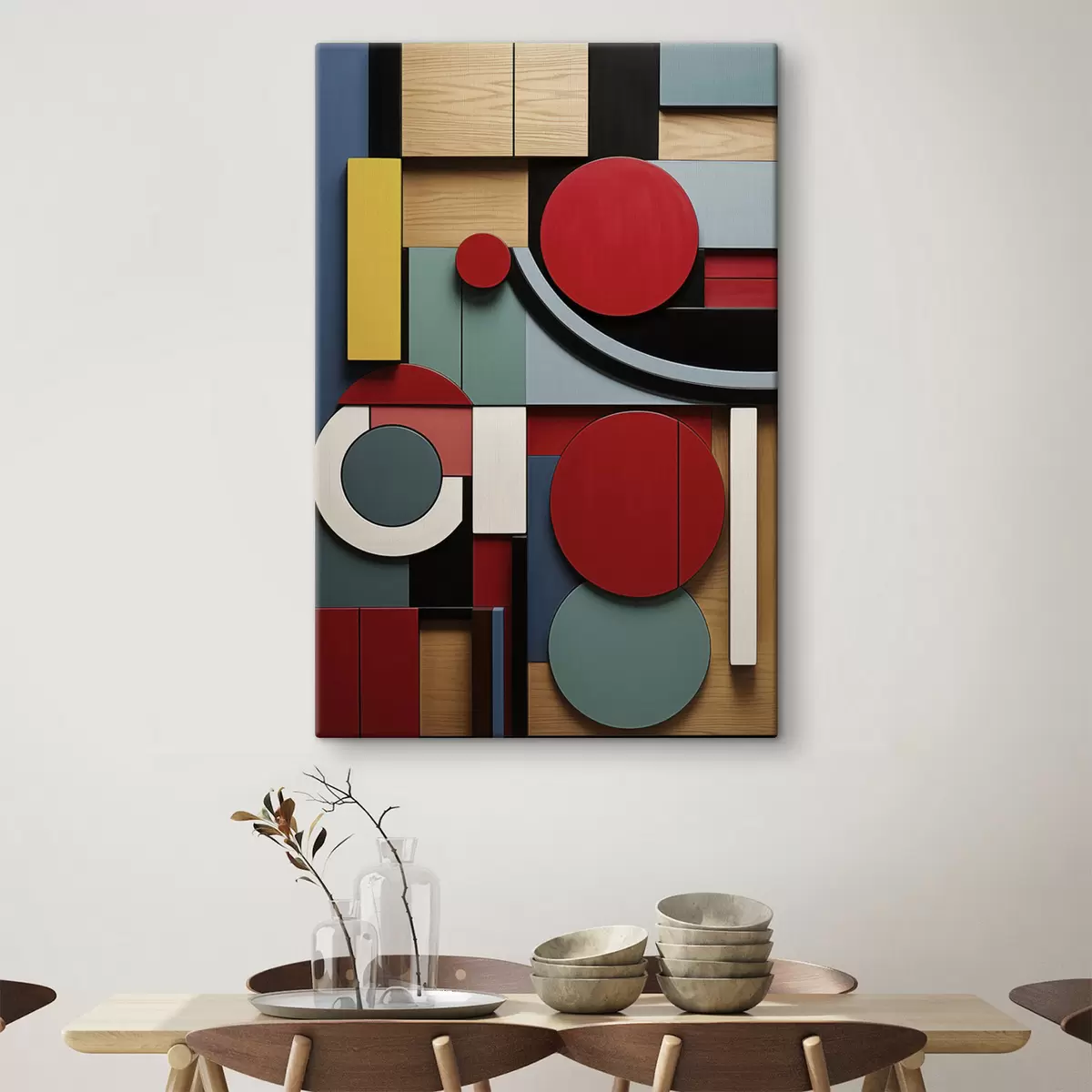 Картина Абстрактна геометрична композиція з імітацією текстури дерева, червоними, чорними, білими та бірюзовими прямокутниками та колами Арт. s47876