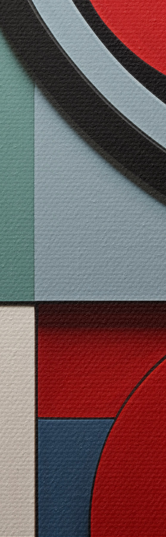 Картина Абстрактна геометрична композиція з імітацією текстури дерева, червоними, чорними, білими та бірюзовими прямокутниками та колами s47876