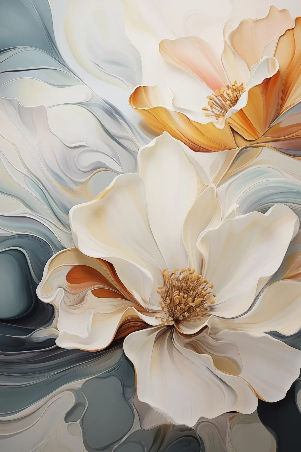 Картина Абстрактна велика квітка з білими, помаранчевими та блакитними пелюстками, фактурний фон s47878